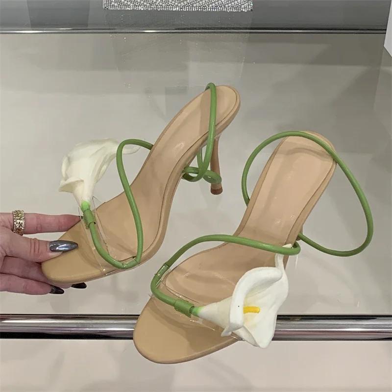 Fashion Elegant Transparent Pvc Flower Decorated Heeled Sandals Women Sexy Peep Toe Thin High Heels Fashion Party Dress Shoes for Women