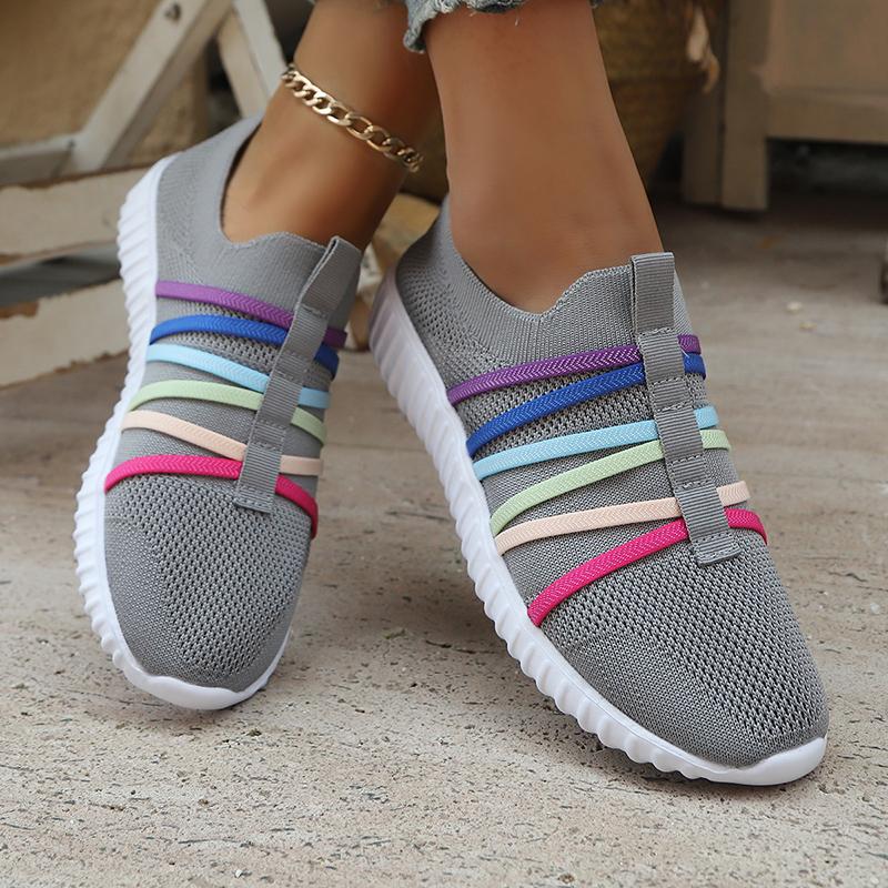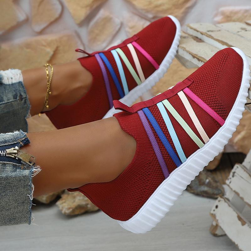 Мода Мода Радужная лента Вязаные кроссовки Женские Сетчатые дышащие Беговые спортивные туфли Женские Большой размер Комфортные слипоны для ходьбы