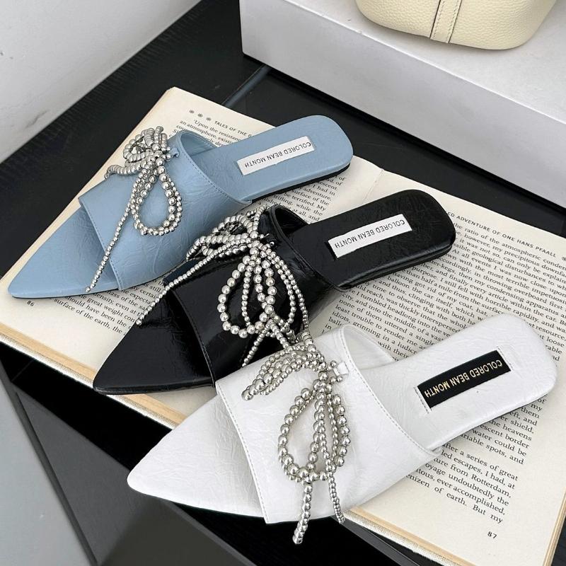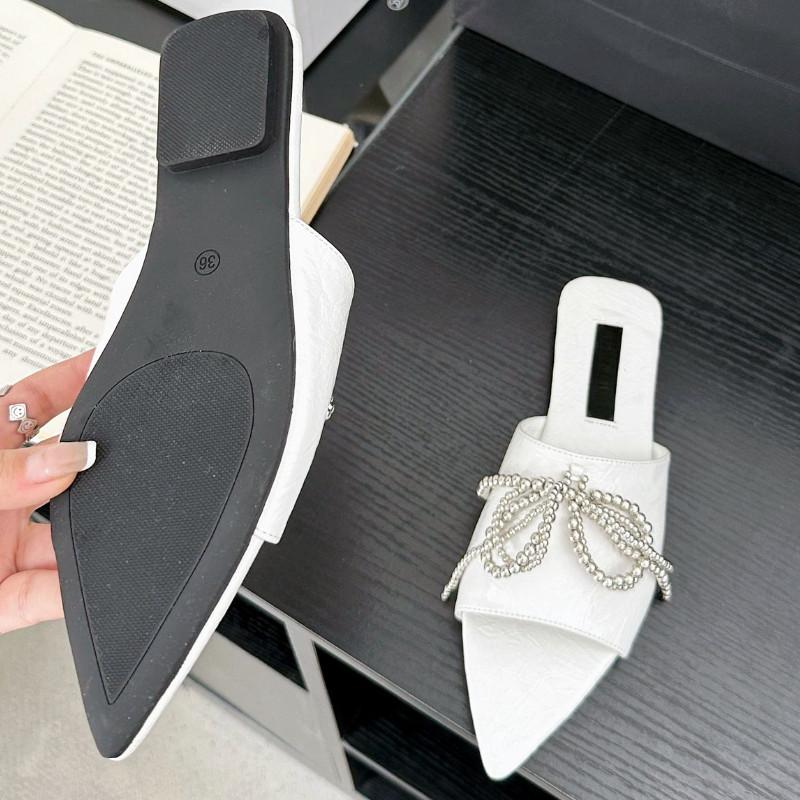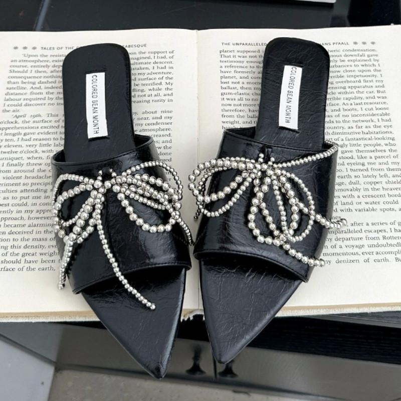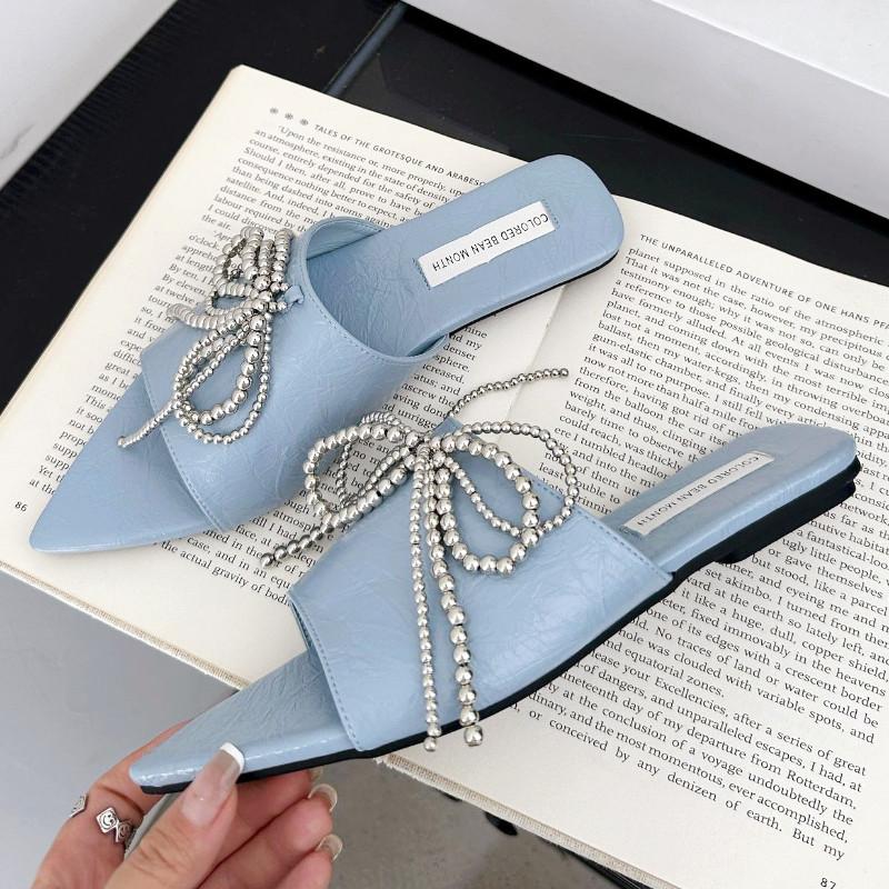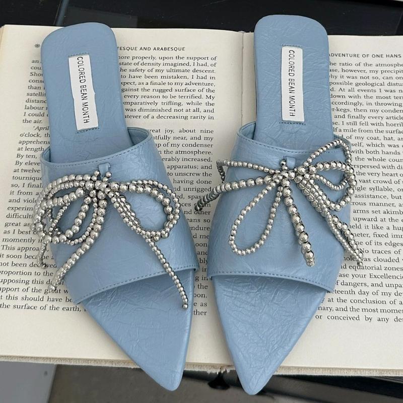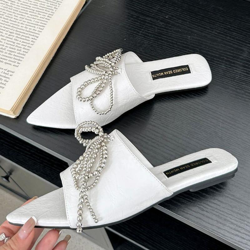 Fashion Metal Beaded Bow Decoration Flat Slippers Women Summer Sexy Pointed Toe Open Toe Slide Sandals Soft Leather Cozy Beach Sandals