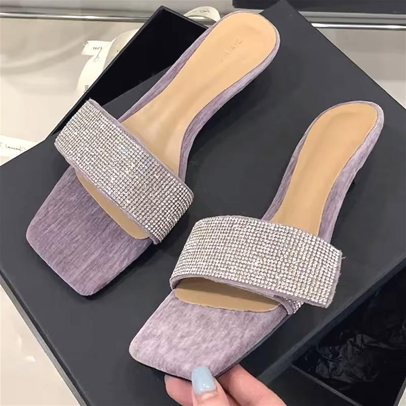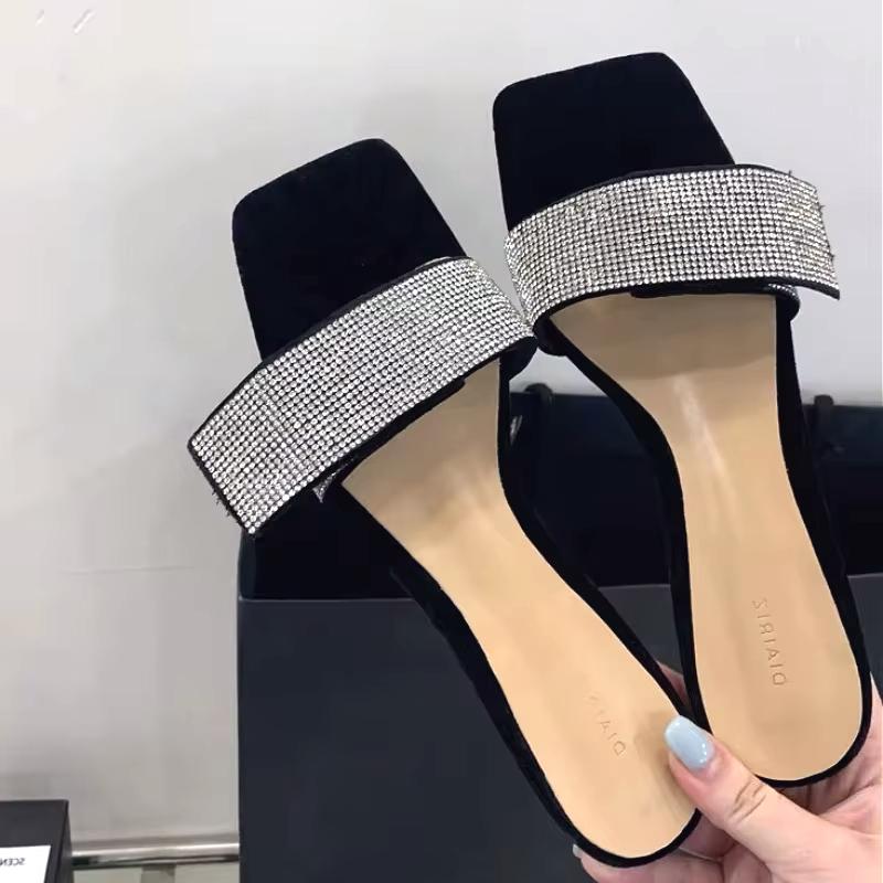 Fashion Luxury Rhinestone Thin Heel Slippers for Women Summer Comfort Square Toe Open Toe Non-slip Sandals Concise Designer Casual Shoes