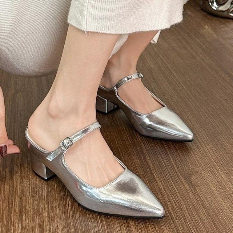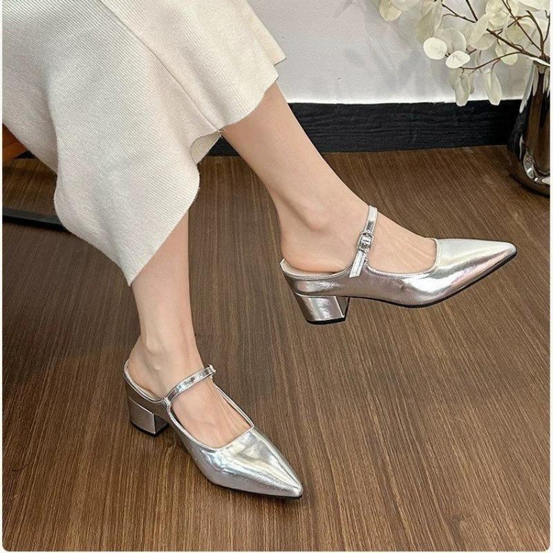 Fashion Wearing Baotou High-heeled Shoes for Women in Summer New Pointed Toe Shallow Mouth with Square Heel Slippers