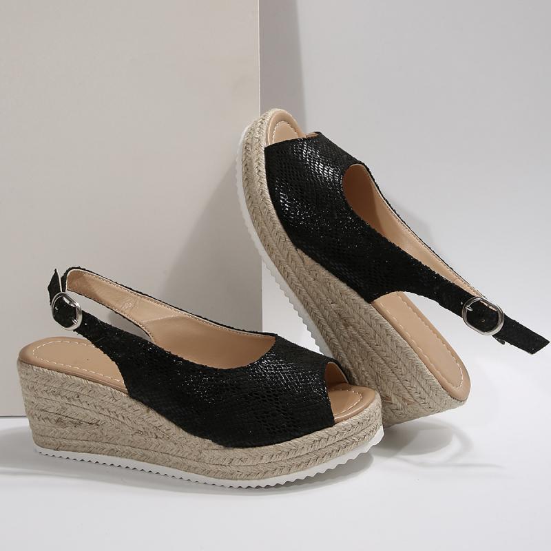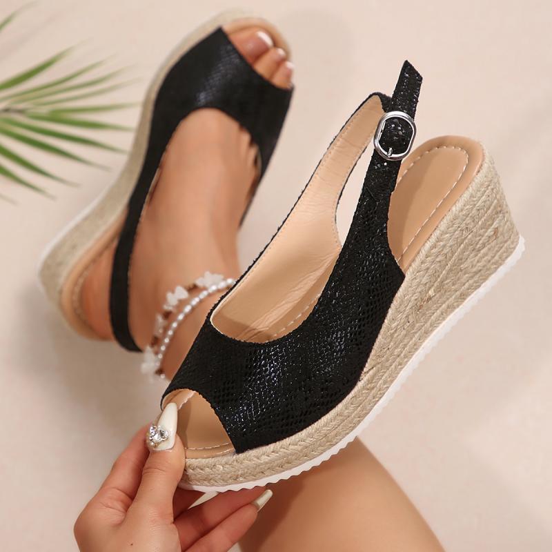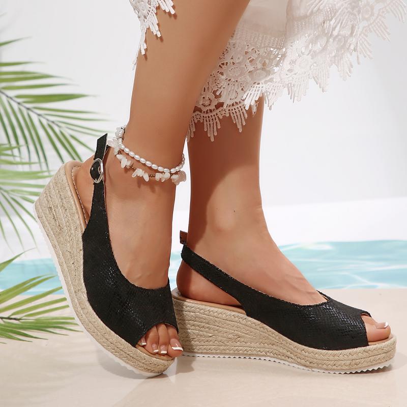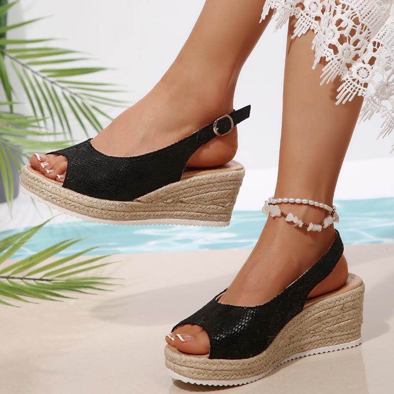Модные сексуальные черные босоножки с открытым носком женские 2025 лето танкетка ремешок сзади туфли женские повседневные пеньковая подошва пляжные сандалии большой размер 43