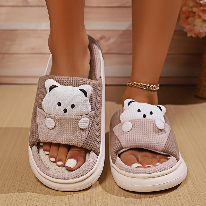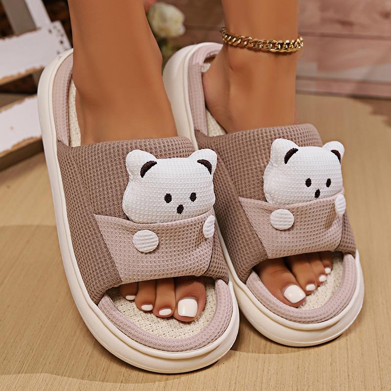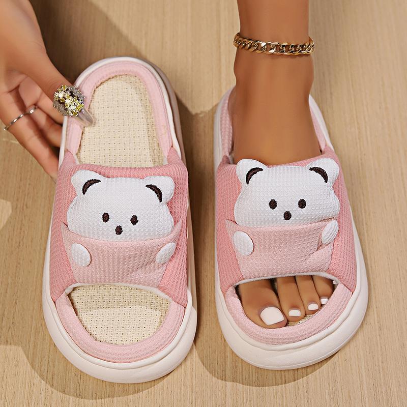 Модные милые мультяшные льняные тапочки с медведем для женщин, дышащая подошва, всесезонные домашние тапочки, удобные, больших размеров 45, унисекс, домашние шлепанцы