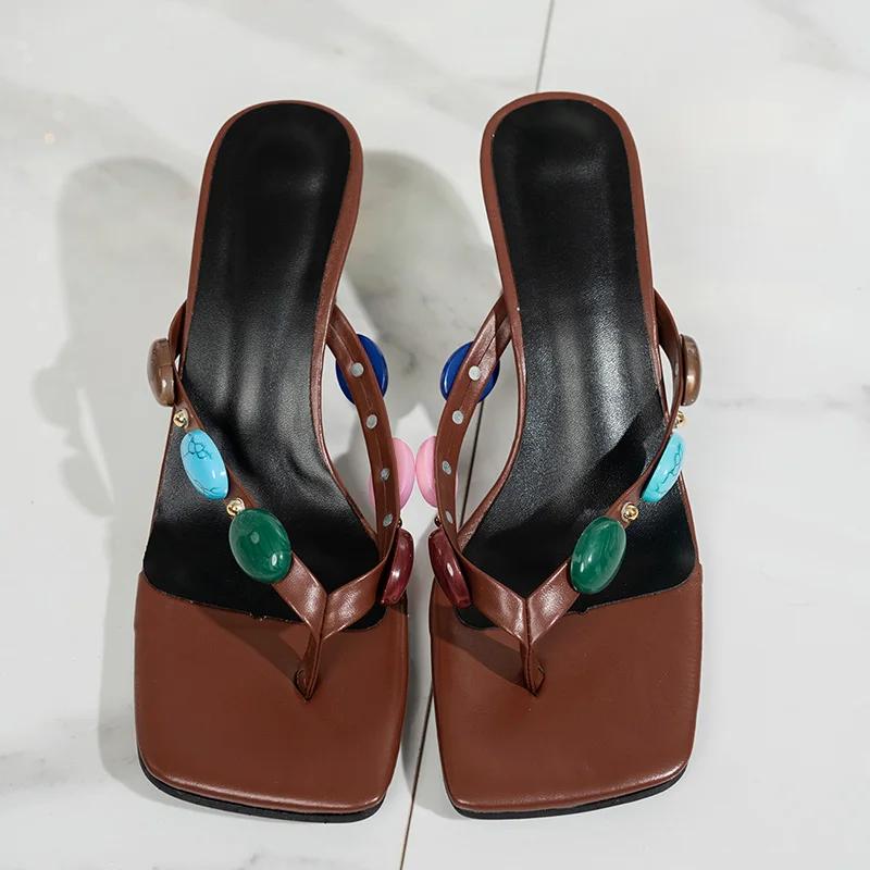 Модные роскошные дизайнерские сандалии с перемычкой для пальца с бирюзовым камнем для женщин Лето 2025 Мюли с большим квадратным носком Женские туфли на высоком каблуке-рюмочке Шлепанцы