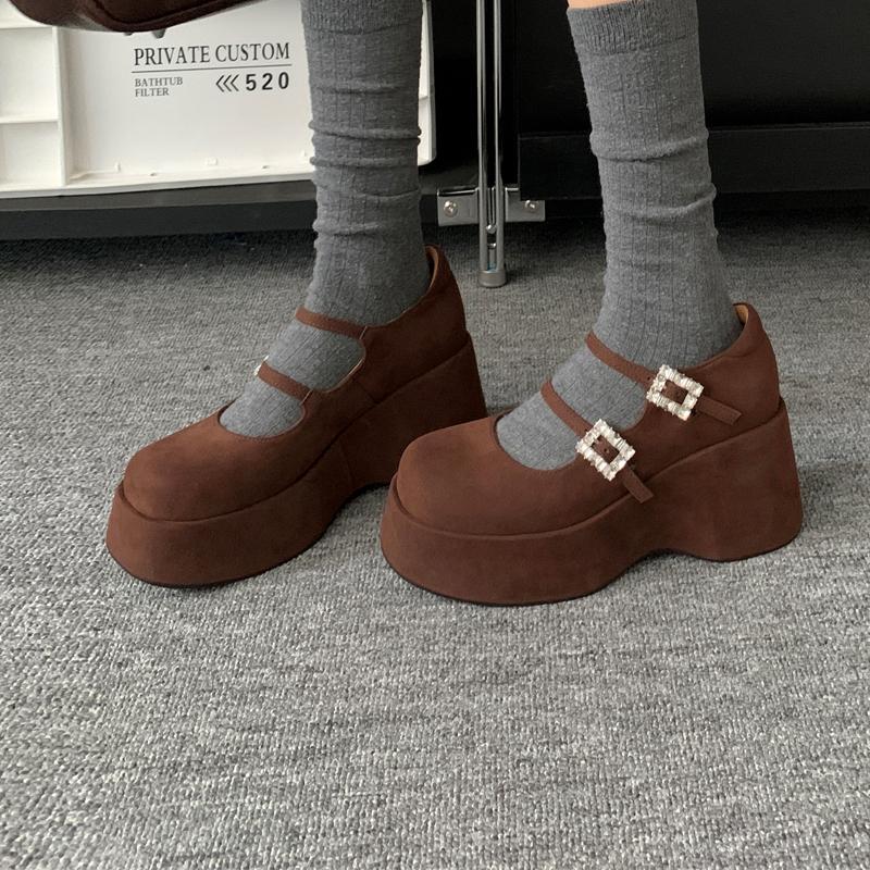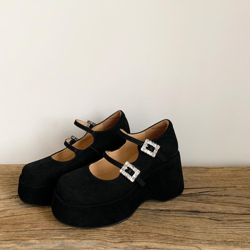 Мода 2025 Новые весенние туфли Мэри Джейн на платформе Элегантные туфли с круглым носком Кристальная пряжка на ремне Клинья Туфли-лодочки Обувь на плоской платформе