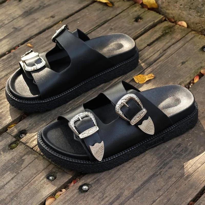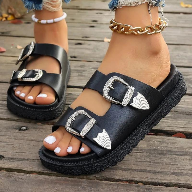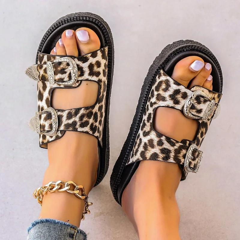 Модные женские сандалии Высокое качество Леопардовый дизайн с металлической пряжкой Шлепанцы Сексуальный комфорт Нескользящие шлепанцы Летние сандалии на платформе