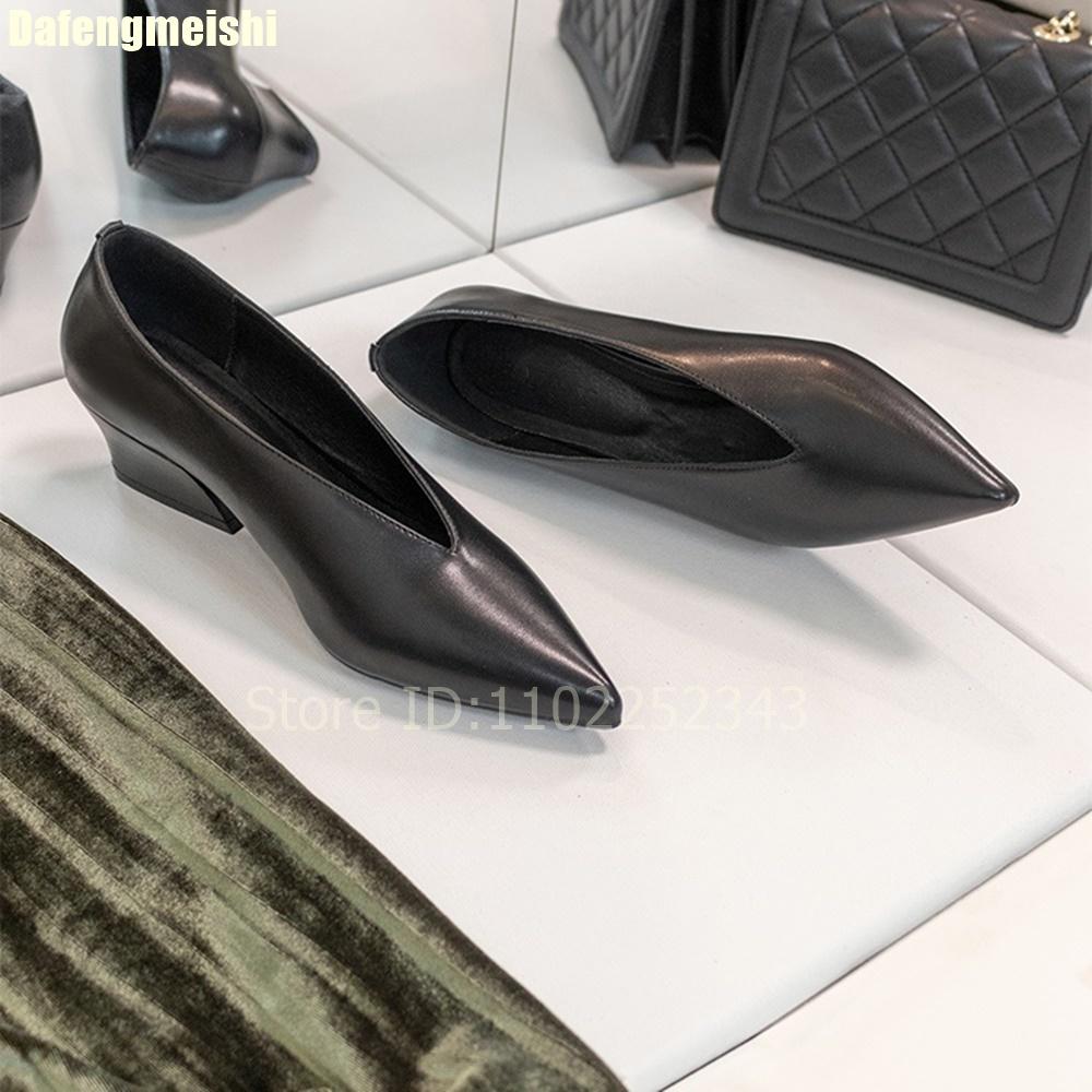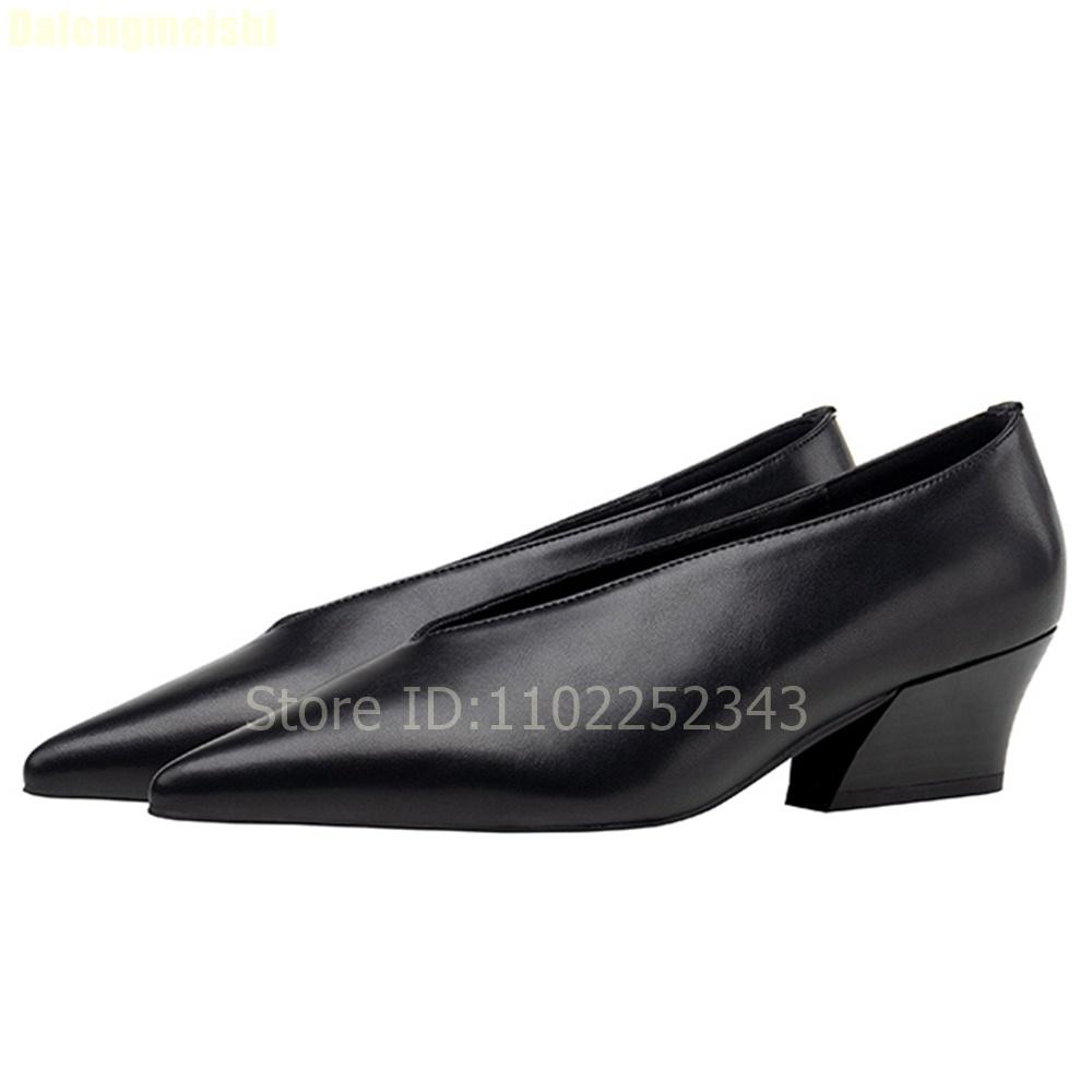 Fashion 2025 Summer New V-Neck Pointed Toe Pumps Women Sexy Black Sheepskin Shallow Slip On Chunky Heels Sandals Casual Fashion Shoes
