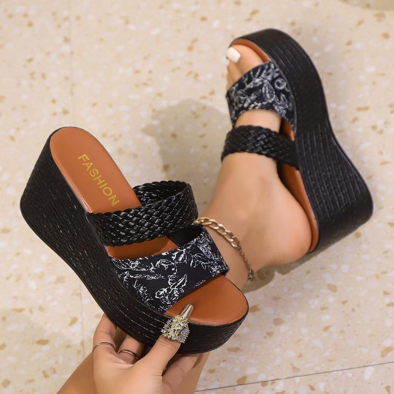 Fashion 2025 Women's Wedge Heel Slippers New PU Leather Elegant Fashion Pattern Design Casual Open-toe Summer Thick-soled Sandals