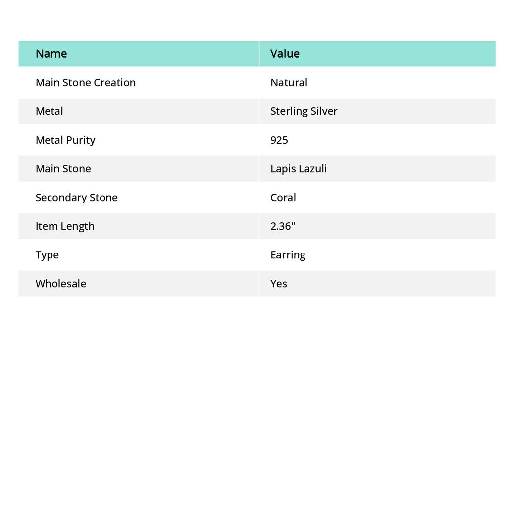 Лазурит, Коралл Драгоценный камень 925 Стерлинговое серебро Ювелирное изделие Серьга 2,36"