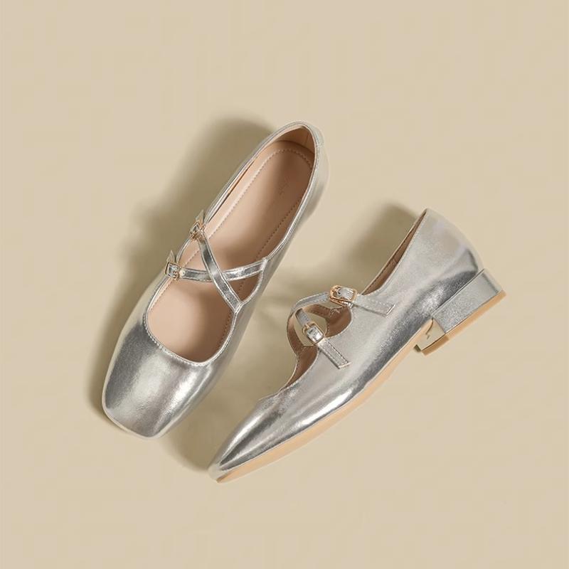 Модные Мягкие Серебристые Туфли Мэри Джейн Лето Новые Французские С мелким вырезом Ретро Квадратный носок Плоские Однослойные Туфли