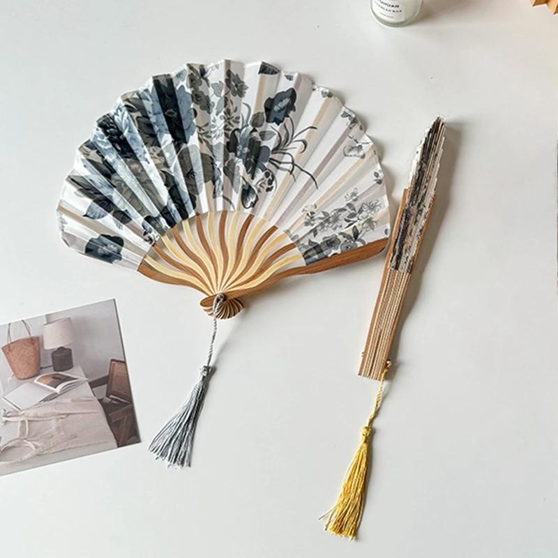 Складной веер из шелка в китайском стиле, веер с цветком, классический ручной веер с чехлом, реквизит для фото, кисточка, складной веер, аксессуары для ханьфу