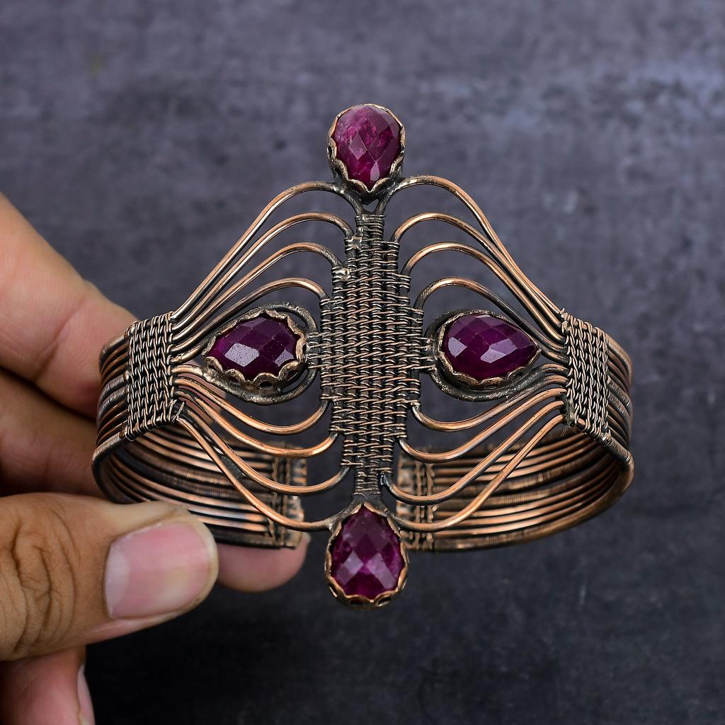 Красный Рубин(Смоделированный) Браслет-манжета из медной проволоки с драгоценными камнями, регулируемый