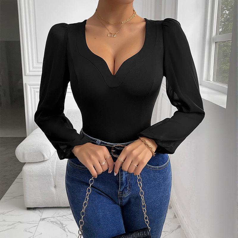 Новый сексуальный облегающий женский комбинезон с длинными рукавами, квадратным вырезом, однотонный, черный, с сетчатыми вставками и V-образным вырезом