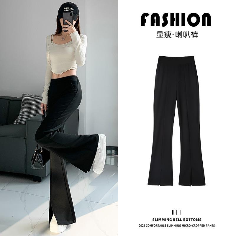 Черные расклешенные брюки женские весенне-осенние новые с высокой талией и тонкие высококлассные драпирующиеся летние брюки с разрезами и микро-клешем