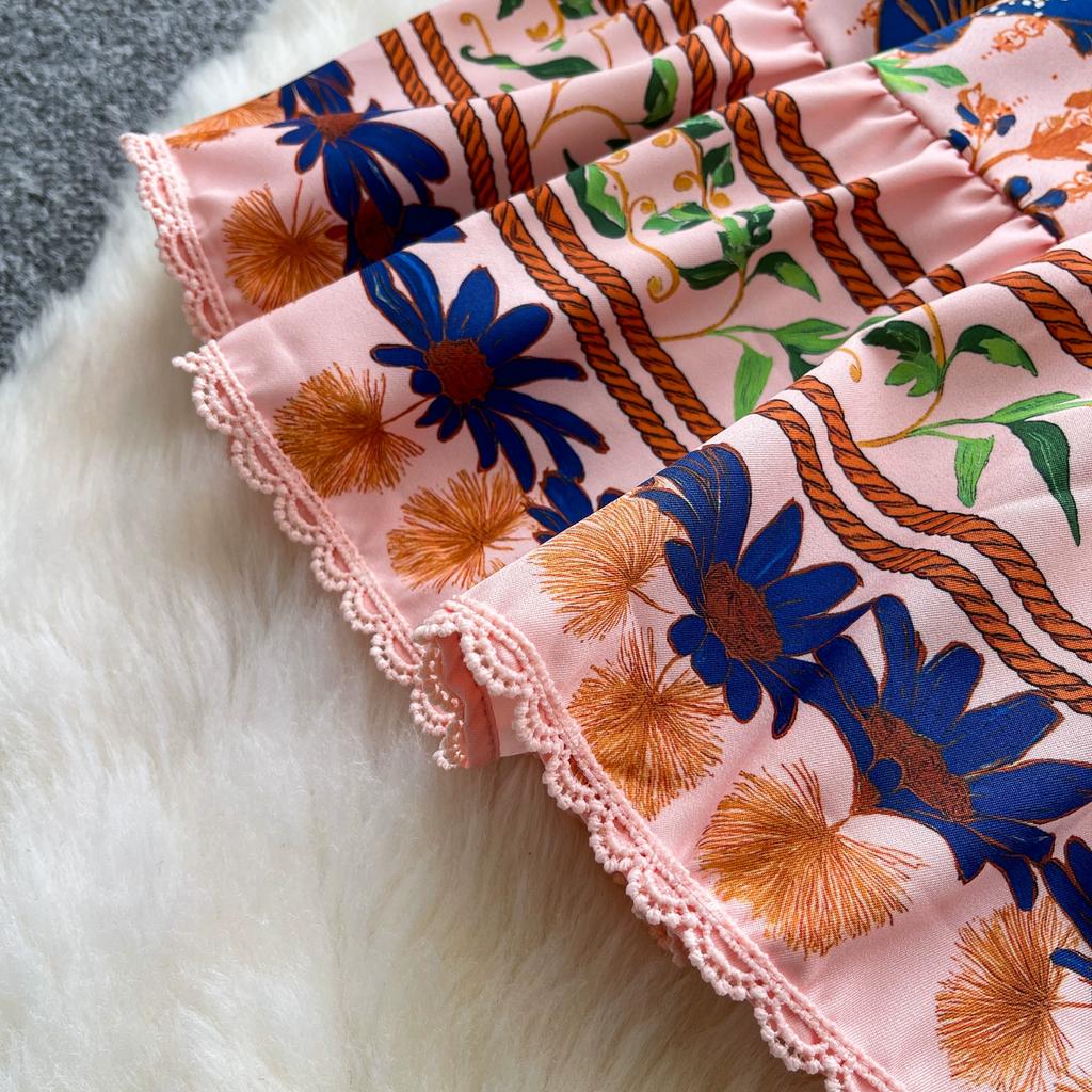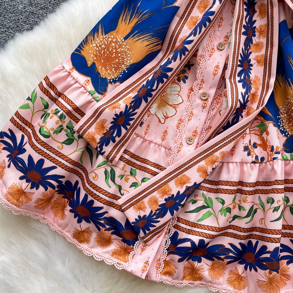 Летние женские платья мини с короткими рукавами-буфами, воротником-стойкой, застежкой на одну пуговицу, кружевной отделкой пэчворк и принтом для вечеринок