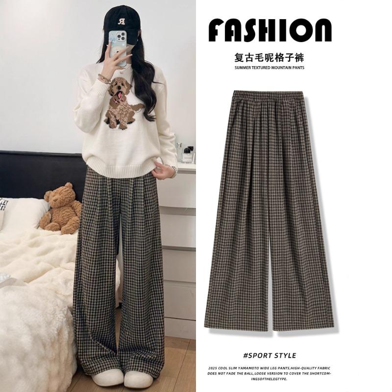 Детские новые осенние брюки в клетку черного и серого цвета с высокой талией, драпирующиеся, свободные, повседневные, из тонкой шерсти, широкие брюки