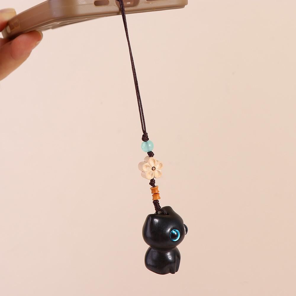 Короткий шнурок Ручной работы Сандаловое дерево Брелок Кольцо для мобильного телефона Подвеска Счастливый кот Ремешок для ключей