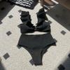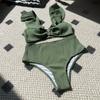 Женский купальник бикини с высокой талией, однотонный, с V-образным вырезом, купальный костюм, треугольный топ с оборками, пляжный, летний, из двух частей
