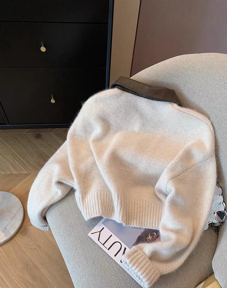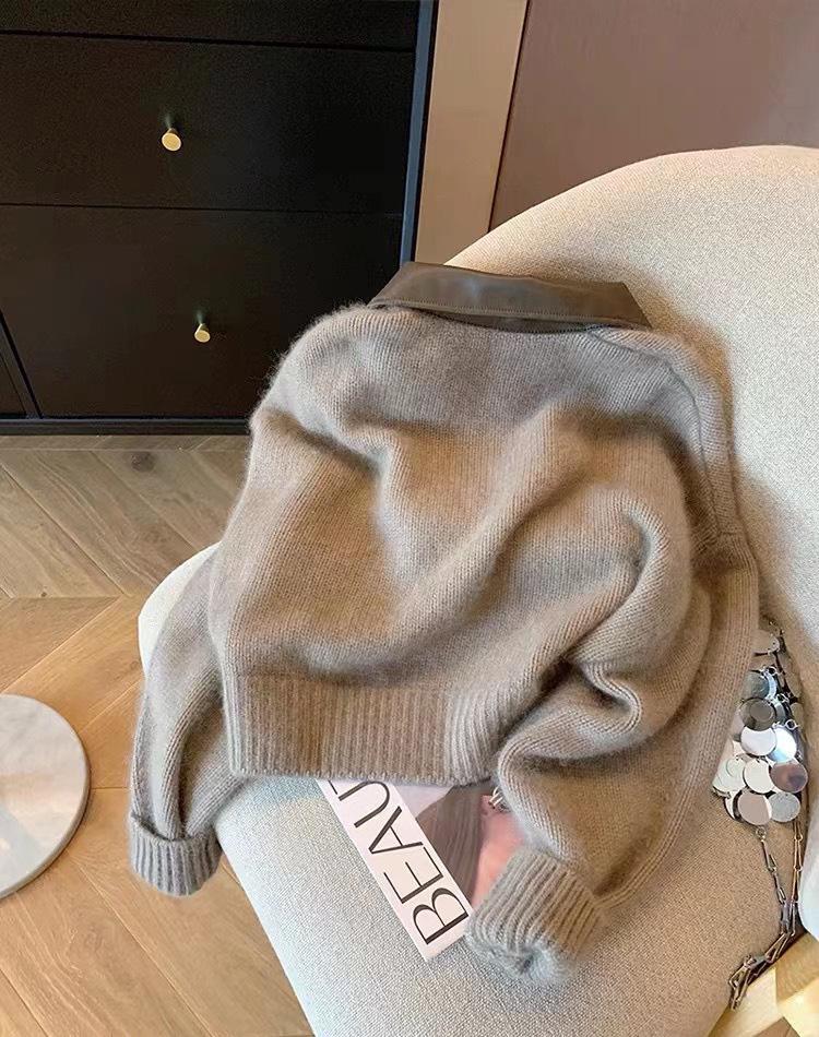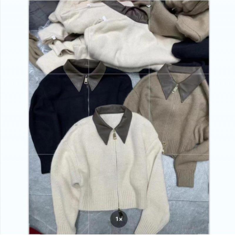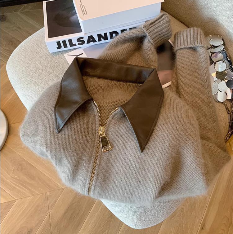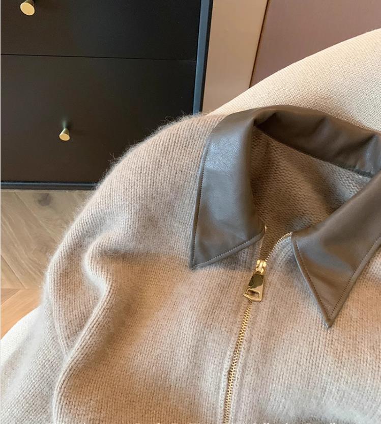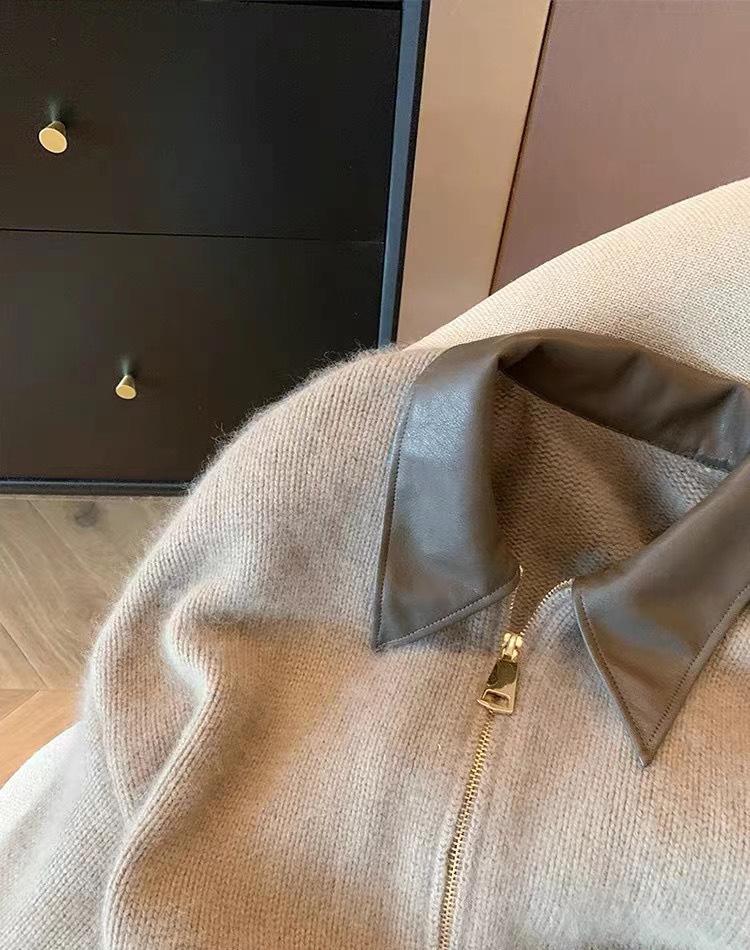 Европейский кожаный свитер на молнии с воротником поло 2023: Вязаный кардиган на осень/зиму для женщин