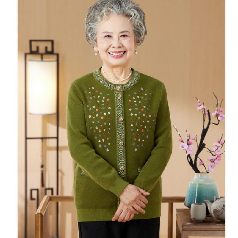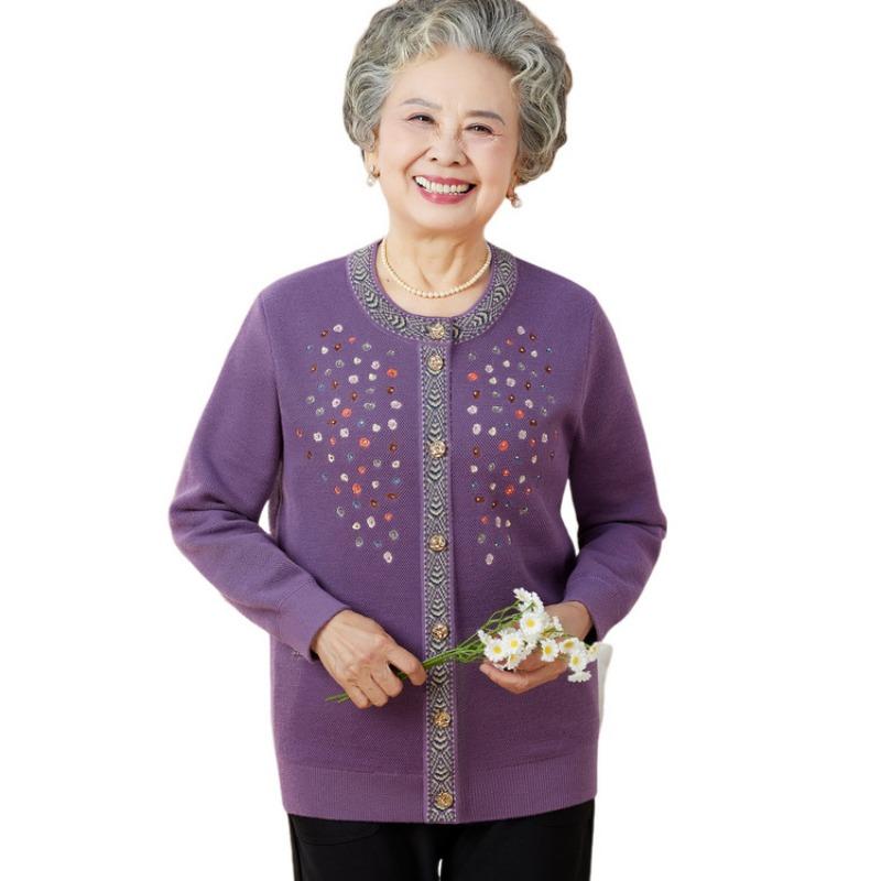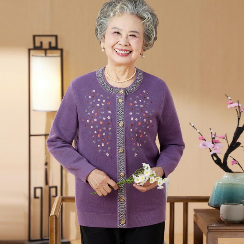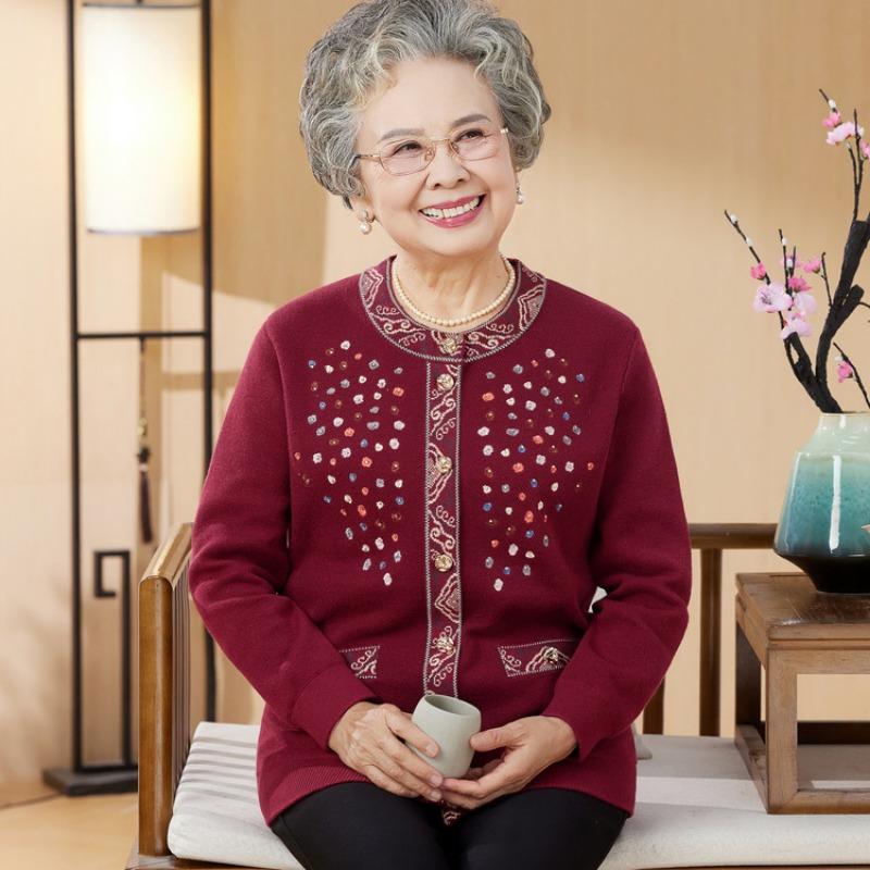 Осень Вязаный свитер для бабушки с круглым вырезом Одежда Среднего и Пожилого возраста Женская одежда Одежда для мамы Кардиган с длинным рукавом