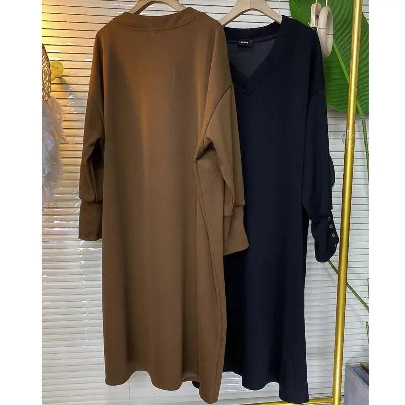Женское осенне-зимнее повседневное платье с V-образным вырезом, свободного и расслабленного стиля, длинное базовое платье для женщин