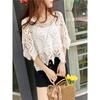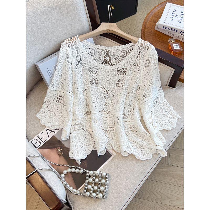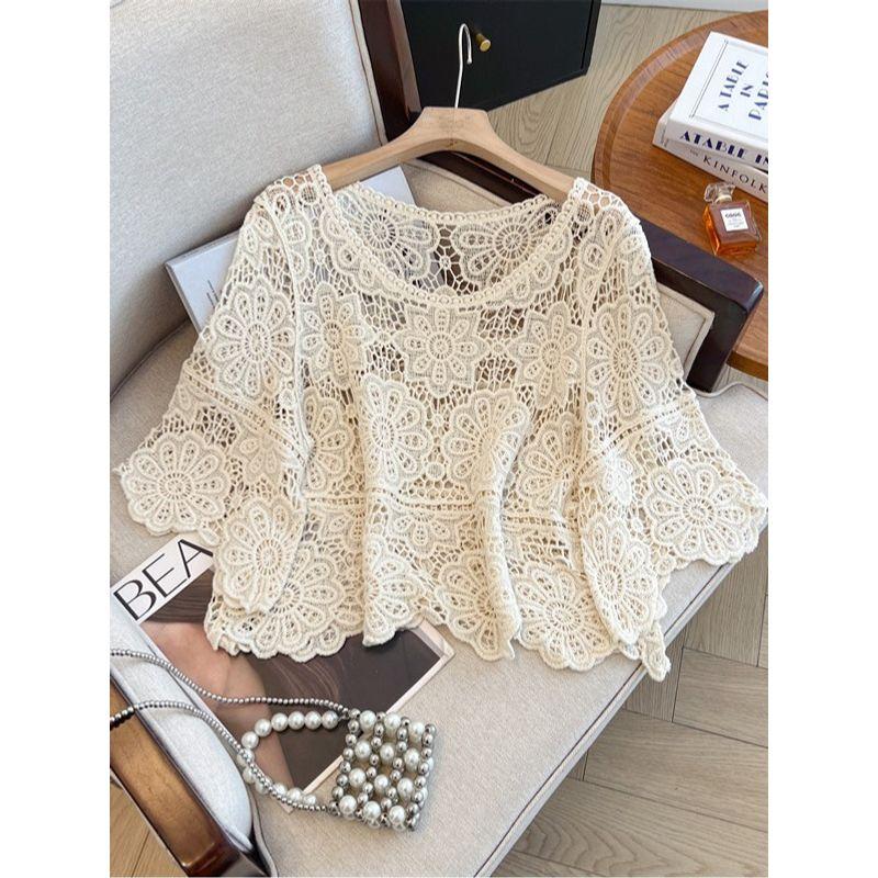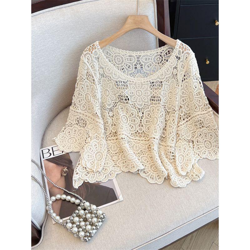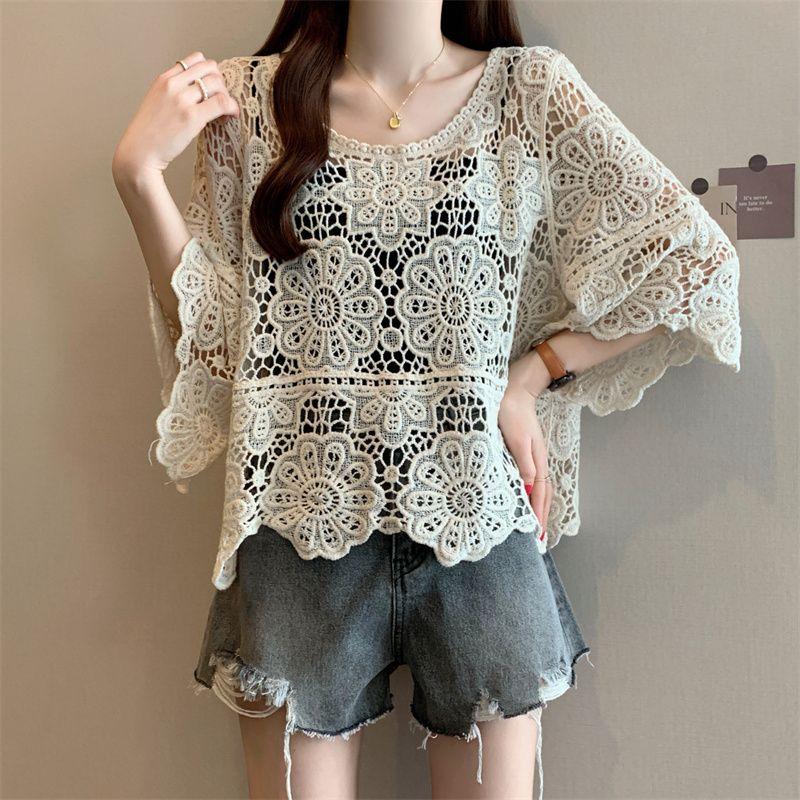 Женская одежда больших размеров для полных девушек, французская вязаная крючком рубашка с кружевом и вырезами, трикотаж с круглым вырезом, повседневная блузка с рукавом 3/4, одежда для защиты от солнца