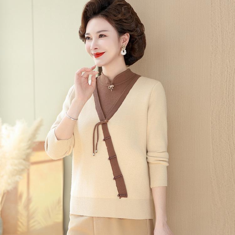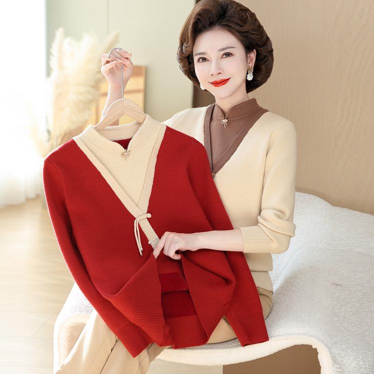 Мамин осенне-зимний свитер в китайском стиле, имитирующий двойку, вязаная базовая рубашка с интегрированным бархатом, новый женский плюшевый толстый топ