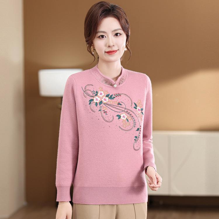 Новый осенне-зимний материнский ципао с вышивкой на воротнике, теплый свитер для женщин среднего и пожилого возраста, китайский стиль, утолщенный цельнокроеный свитер