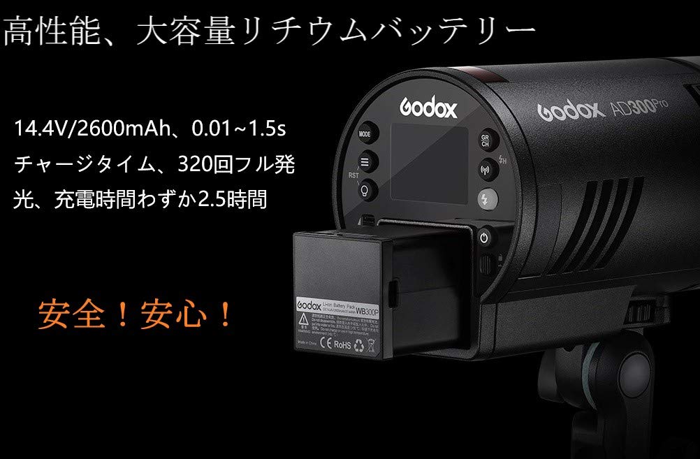 [High-Capacity Built-in] Built-in high-performance, high-capacity lithium battery. The AD300Pro uses a high-performance lithium battery (14.4V/2600mAh), provides 300Ws of power, and has nine adjustable power levels from 1/256 to 1/1. It also has a charging time of 0.01-1.5 seconds, and can produce 320 full-power flashes. It also takes only 2.5 hours to charge. It is compatible with the AD200 and AD200Pro lithium batteries (WB29) and chargers (C29).