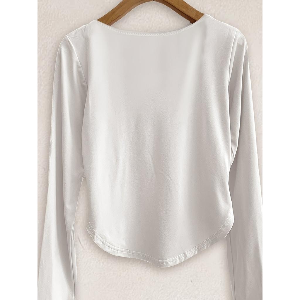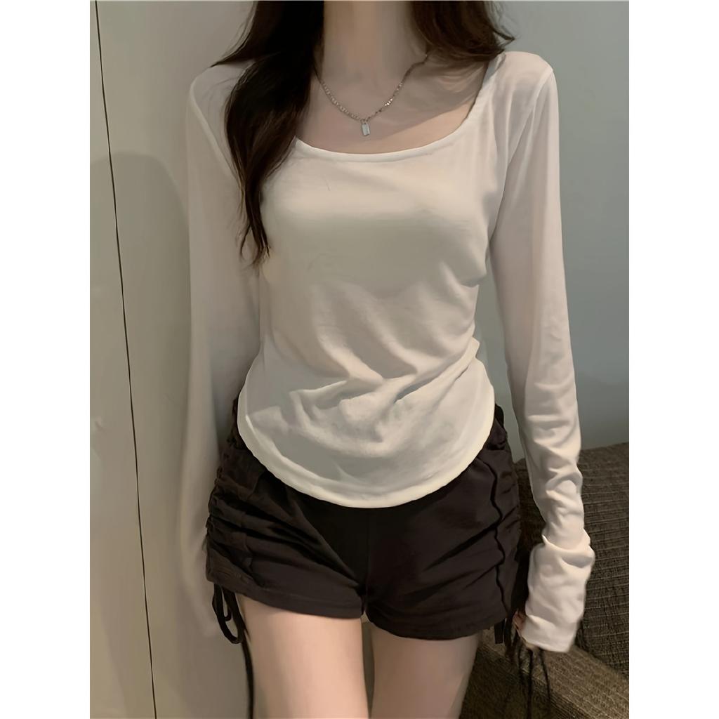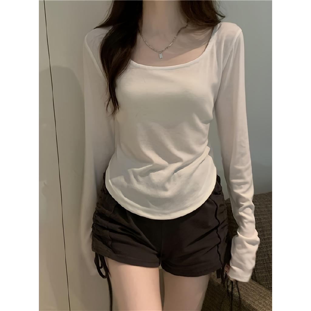 Женская сексуальная футболка из полиэстера с длинным рукавом, однотонный трикотажный топ с круглым вырезом, стандартной длины, мода на весну и осень