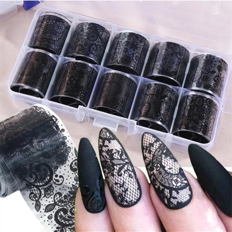 10 рулонов/коробка Белый Черный Кружевной Набор Фольги для Нейл-арта Наклейки для Переноса на Ногти Бумага для DIY Маникюра Аксессуары для Украшения Ногтей