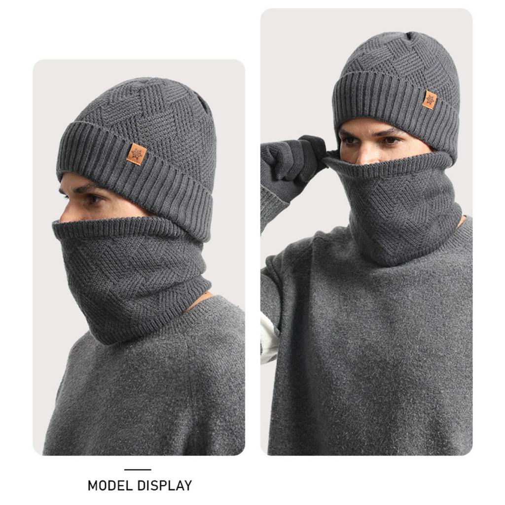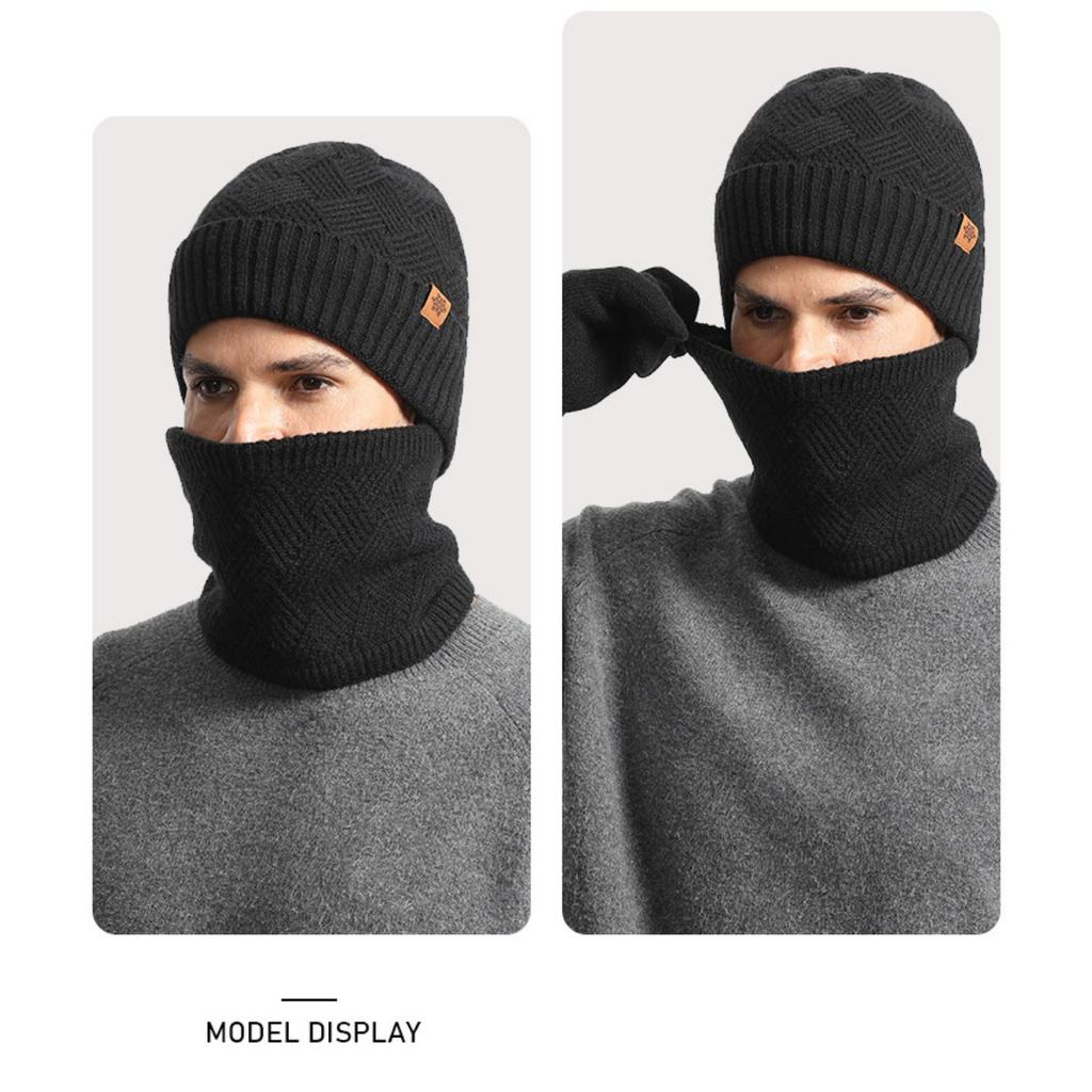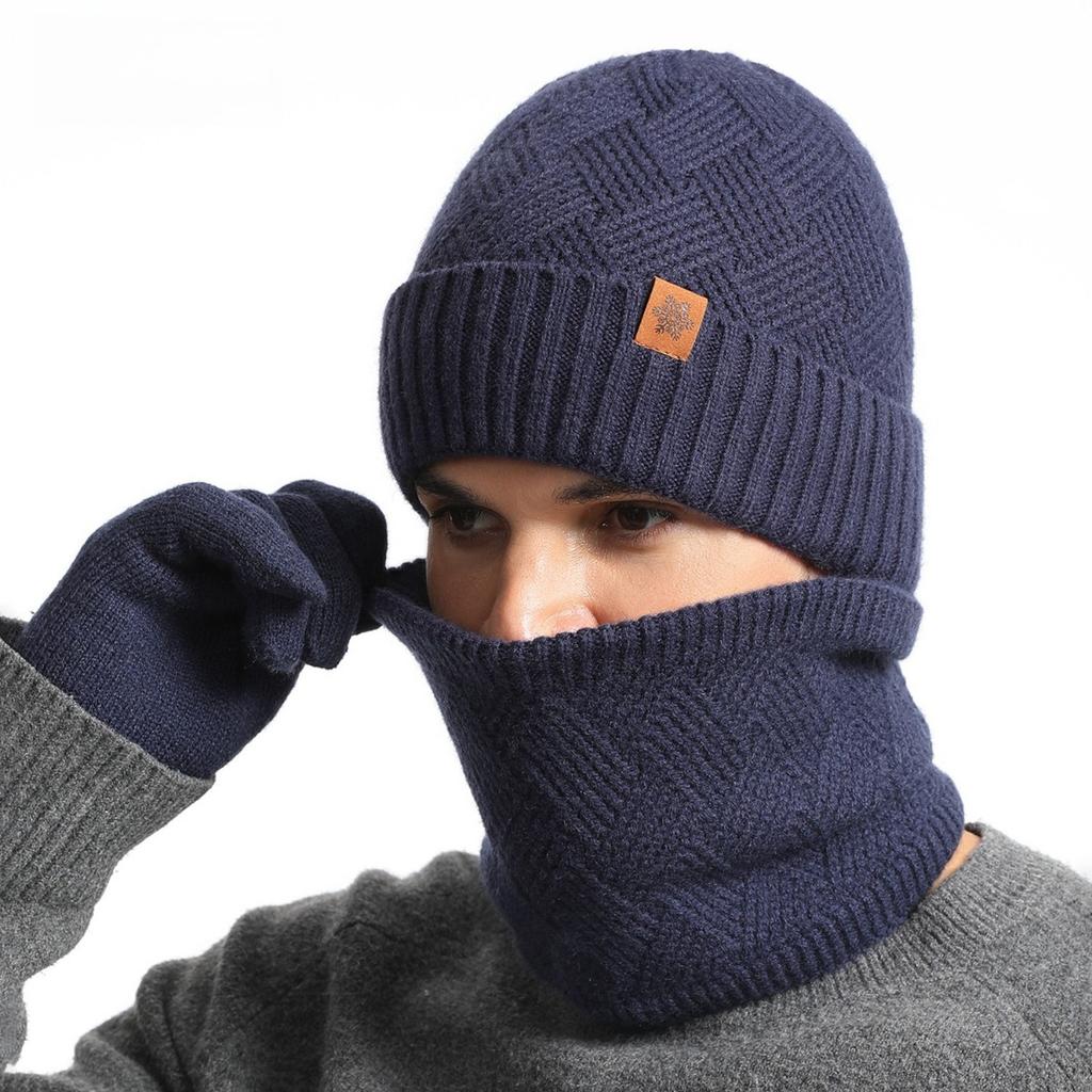 Мужской, Вязаная шапка, Холодная шапка, Вязаная шея, Бархатные перчатки, Утепленный, Двухслойная шея, Перчатки, Шапка, Набор из трех предметов
