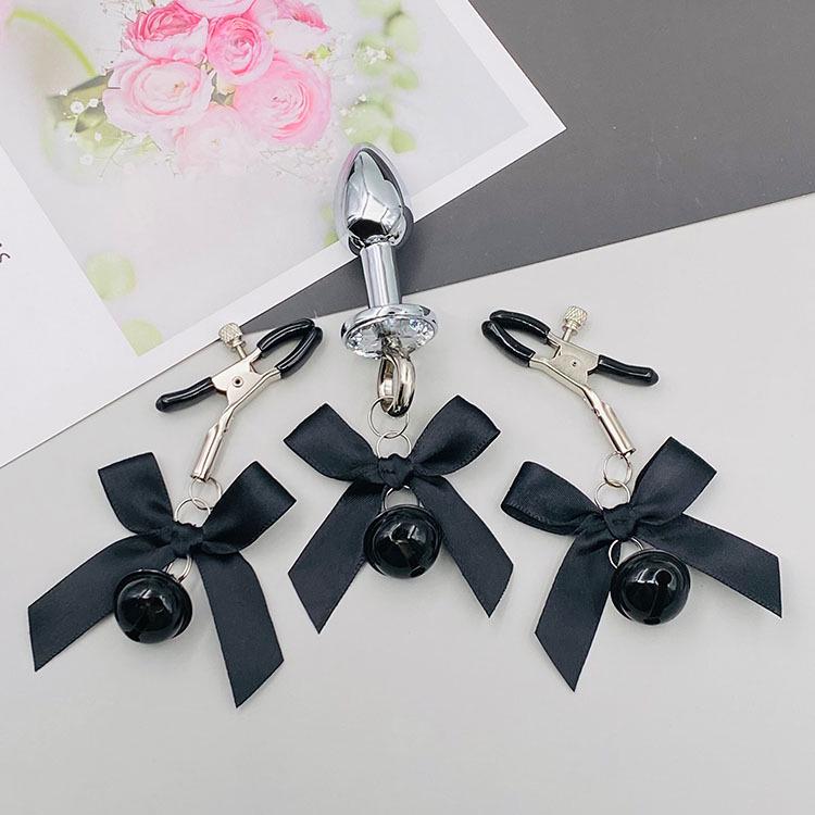 Анальная пробка с бантиком и зажимы для сосков с колокольчиками - Милый флиртующий набор для пар