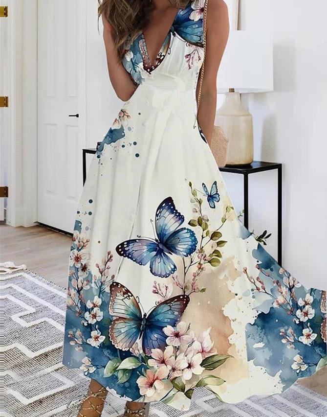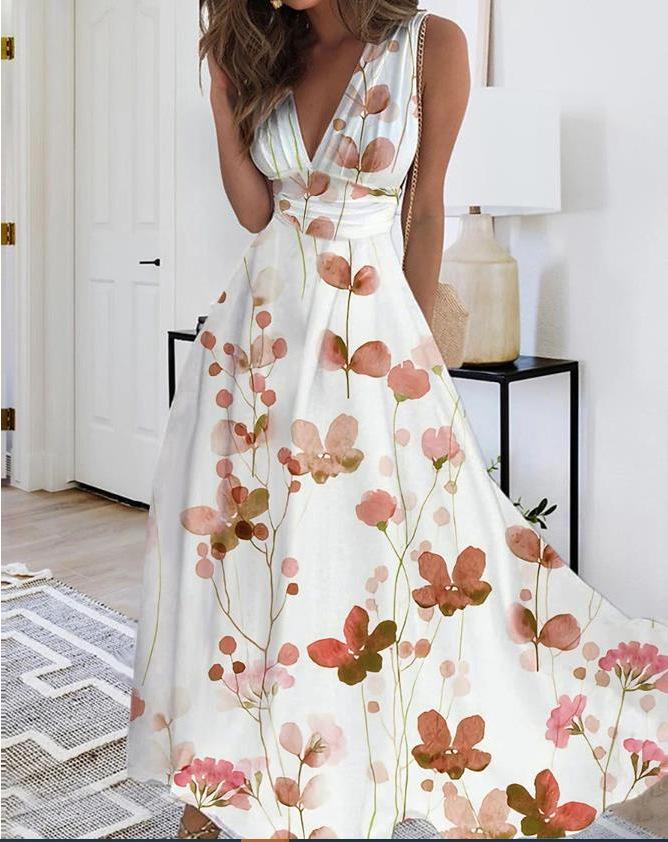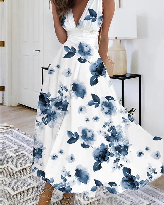 Это стильное женское летнее платье имеет привлекательный V-образный вырез и модный дизайн с завышенной талией, идеально подходящее для прогулок в теплую погоду.. Бесрукавный крой усиливает ощущение легкости, обеспечивая комфорт и свободу движений.. Изготовленное из высококачественного полиэстера, платье отличается мягкой текстурой и легким весом.. Привлекательный печатный узор добавляет игривости, что делает его идеальным выбором как для повседневных, так и для полуформальных случаев.