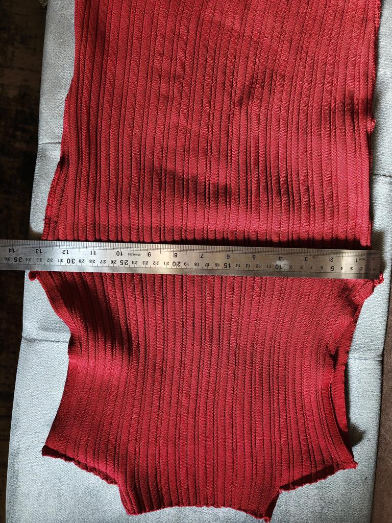 Вся майка - из двух одинаковых кусков со швами по бокам - воротник, плечо, боковые. Очень маленькая, прям детская. Цвет не бордо, не красный, в рыжину, невнятный. Трикотаж грубый.