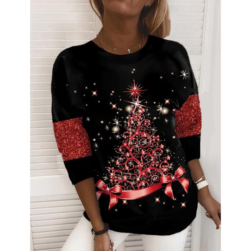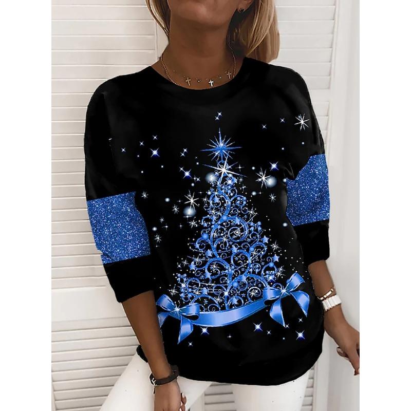 XS-8XL Женская футболка Футболка Снежинка Блестящая Рождественская елка Рождественские выходные Живопись Футболка Длинный рукав Принт Круглый вырез Базовая