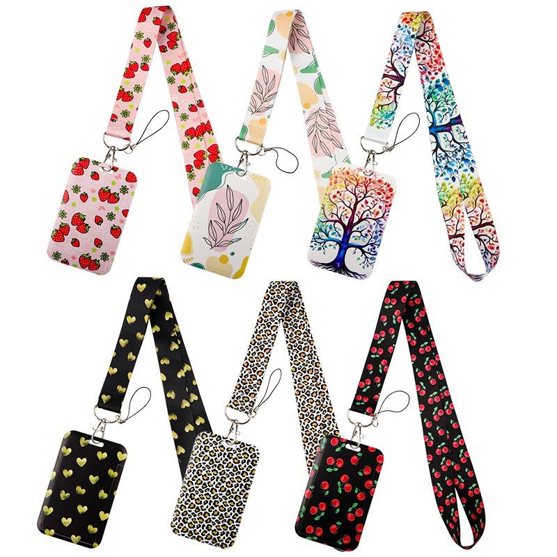 Леопардовый принт, сердцевидный клубничный шнурок для мобильного телефона, проездной, студенческий билет, рабочий пропуск, жесткий многофункциональный картхолдер-шнурок