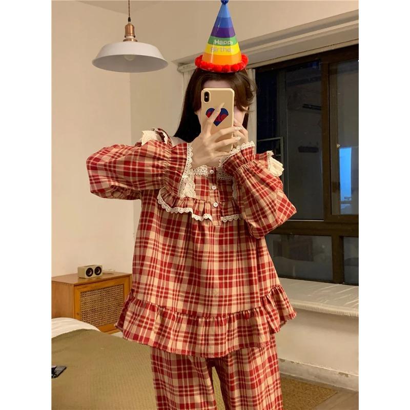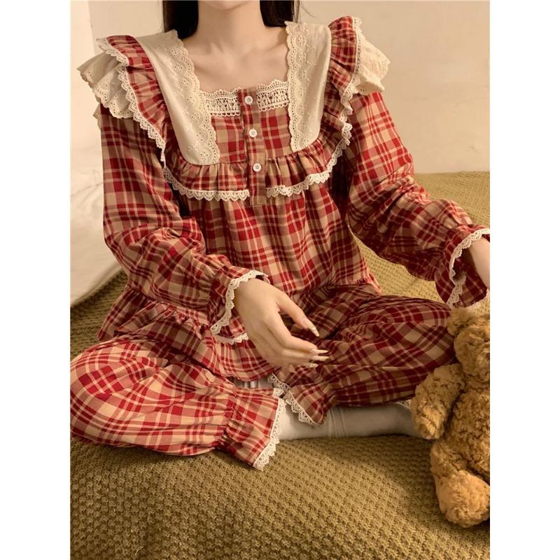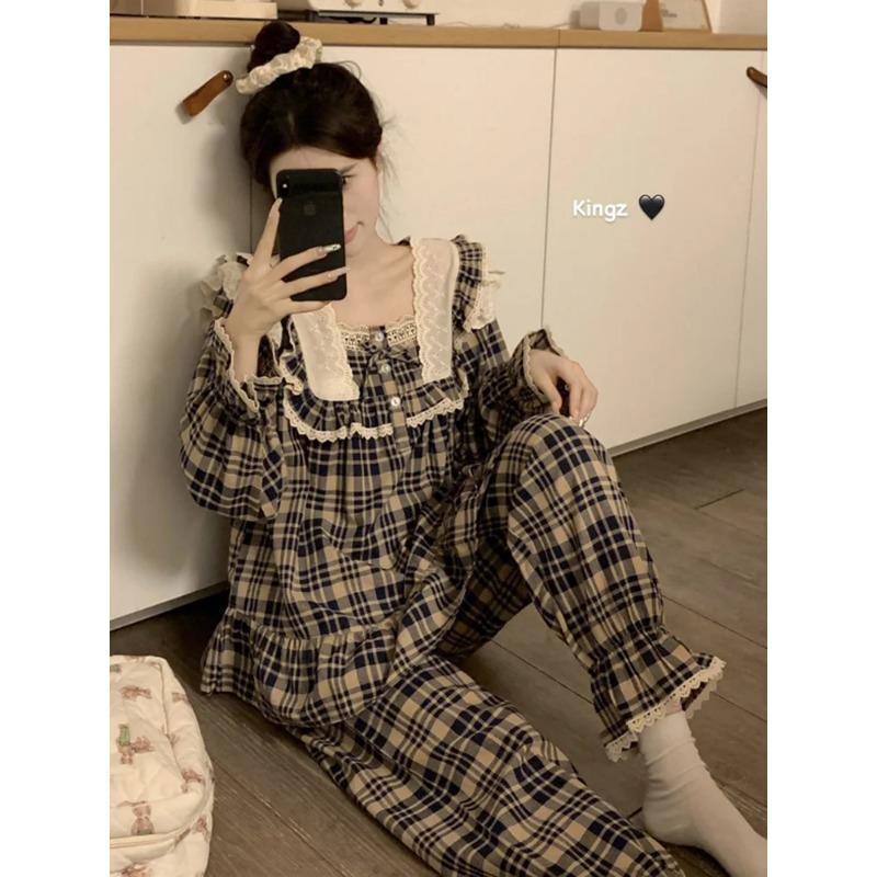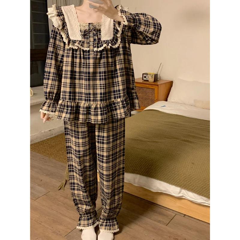 Кружевной домашний мягкий свободный клетчатый британский стиль милый длинный рукав пижамный комплект женский девичий принцесса весенний элегантный повседневный пижамный комплект