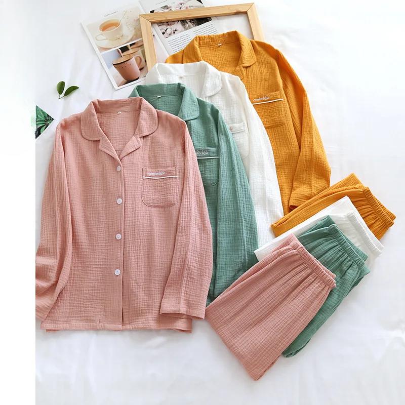 Парная хлопковая креповая двухслойная марлевая пижама для мужчин и женщин большого размера с длинным рукавом однотонная пижама из двух предметов