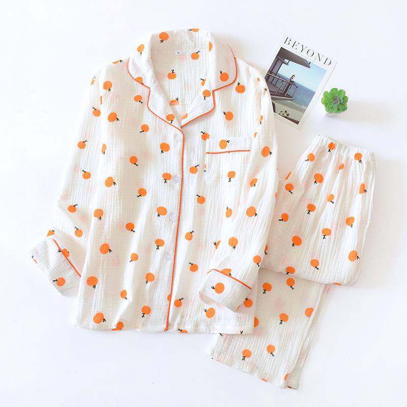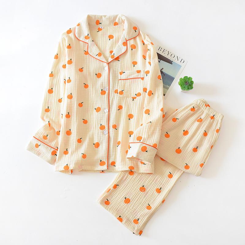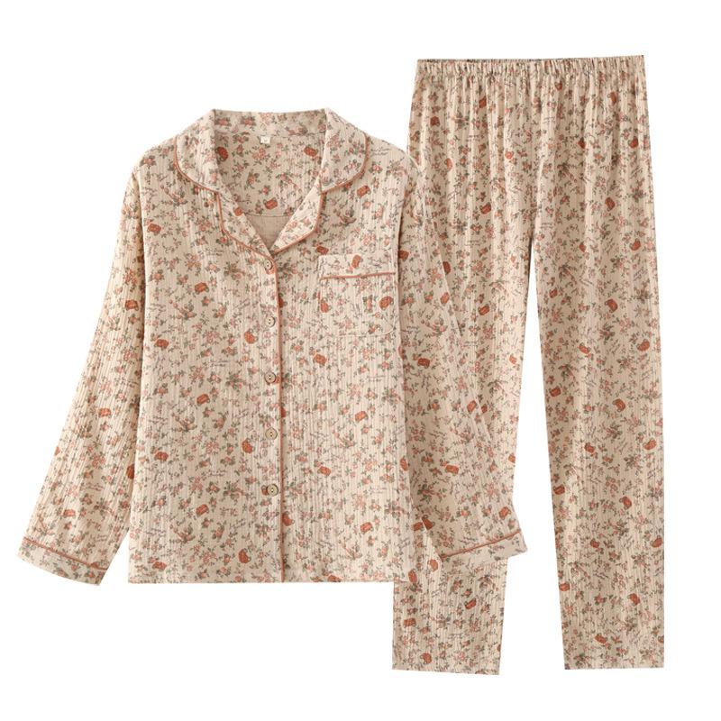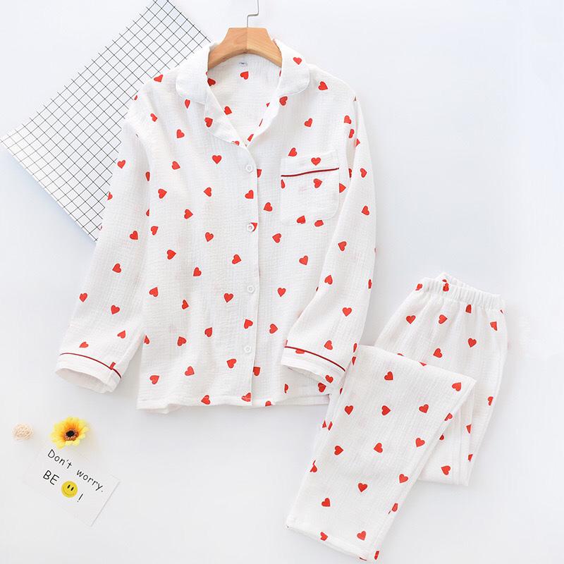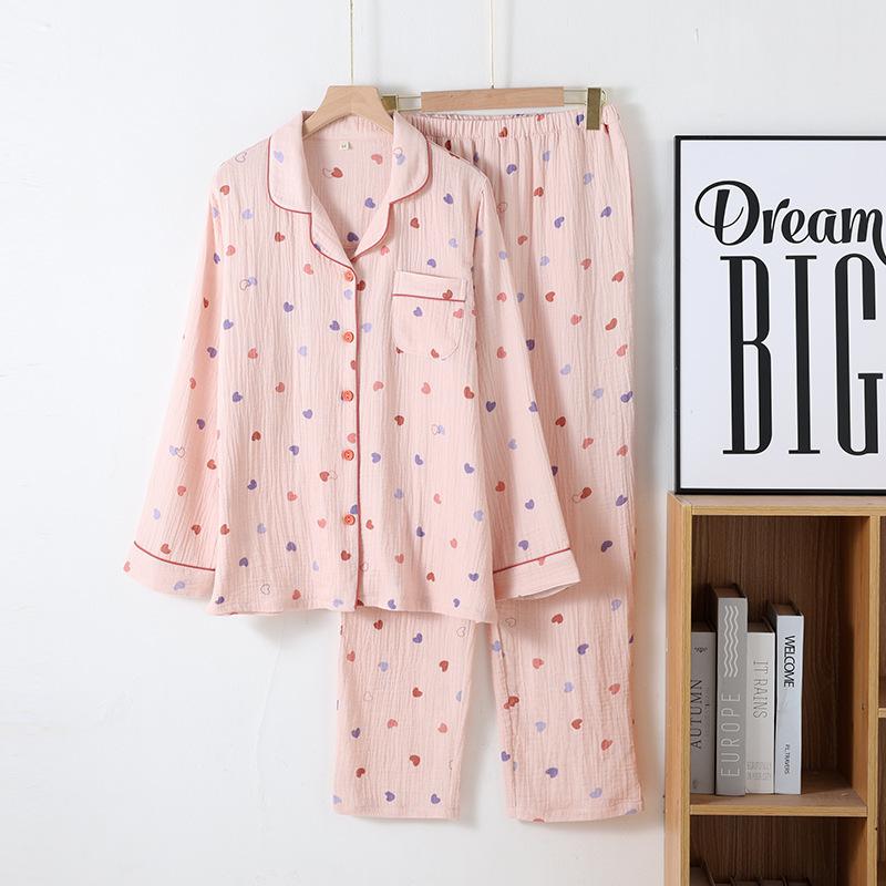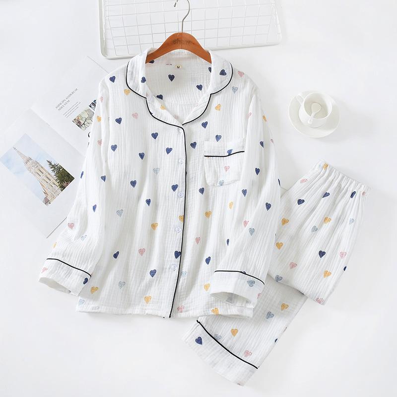 Весенний женский пижамный комплект с принтом в виде сердца из крепа, хлопка, двухслойной марли, отложного воротника, брюк с длинными рукавами, домашняя одежда