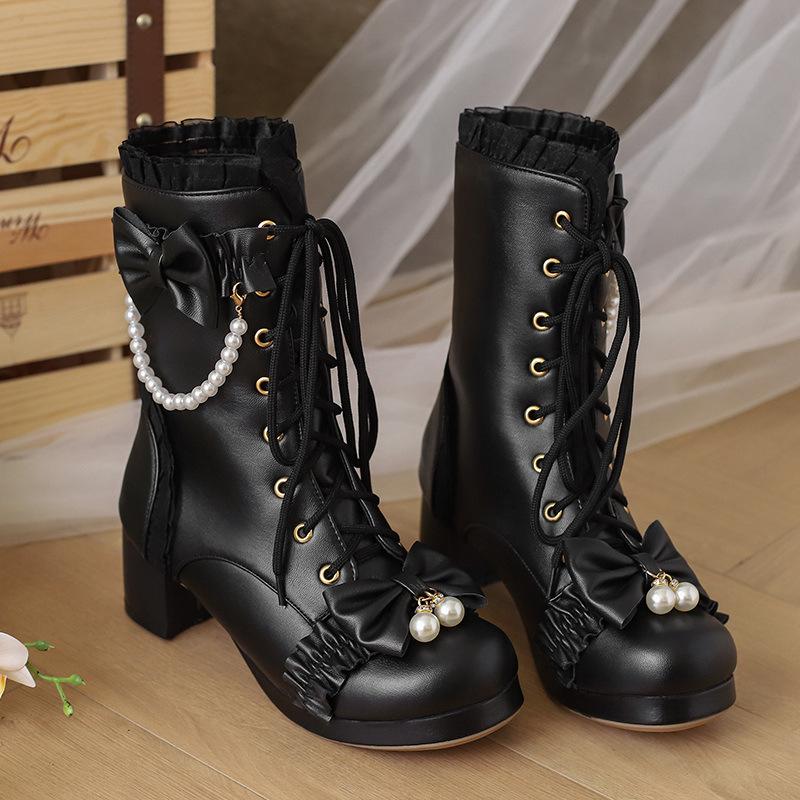 Зимние женские ботильоны до щиколотки Сладкая Лолита Бант Кружево Вечерние Свадебные Туфли Женские Высокие Каблуки Девушки Принцесса Косплей Меховые Сапоги 30-43