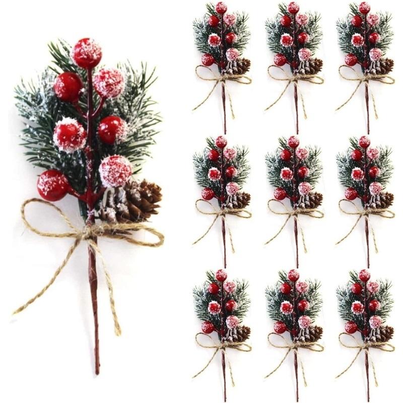 10 шт. Искусственные рождественские пики, Стебли с красными рождественскими ягодами, Сосновые ветки с шишками, Веточка остролиста, Зимний праздничный цветочный пик, DIY украшение