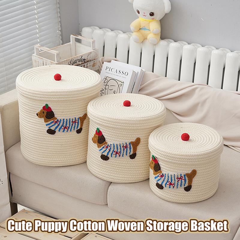 Милая корзина для хранения щенков Плетеная рама из хлопковой веревки Большая вместимость С крышкой Пылезащитное ведро для хранения Настольный пылезащитный