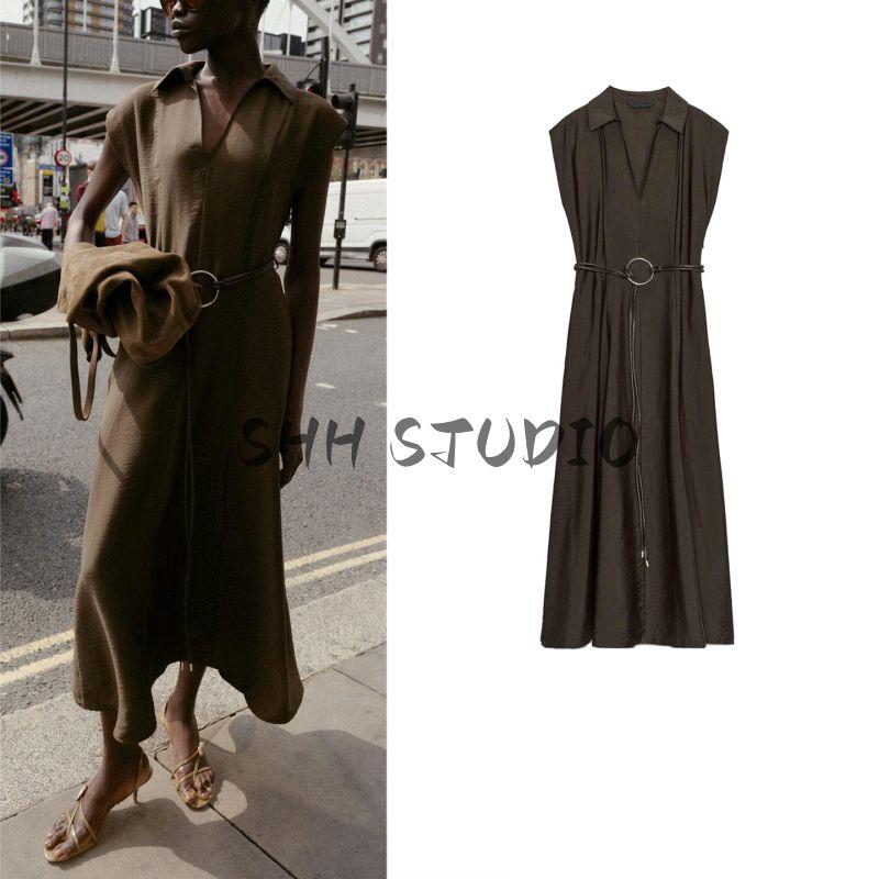 Autumn New Women clothes Seaside Holiday Style V-neck Sleeveless A Word With Belt Midi Dress 5029168