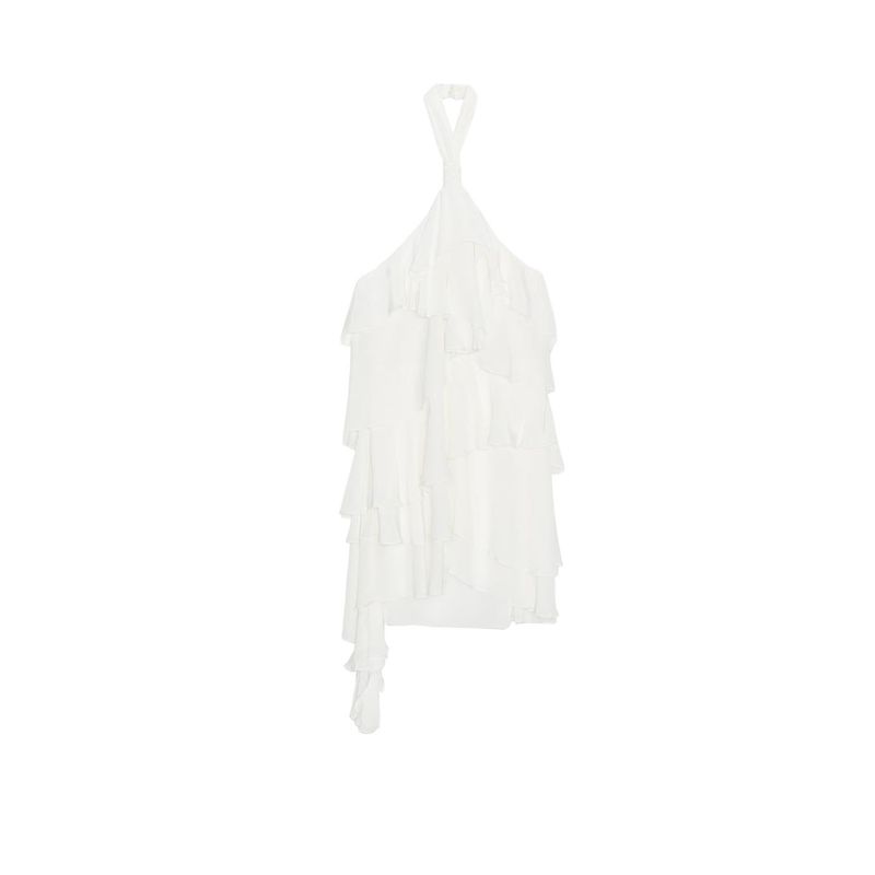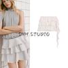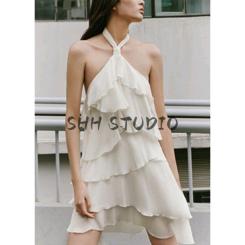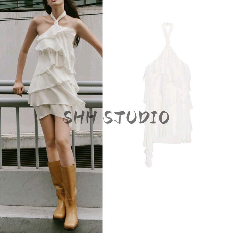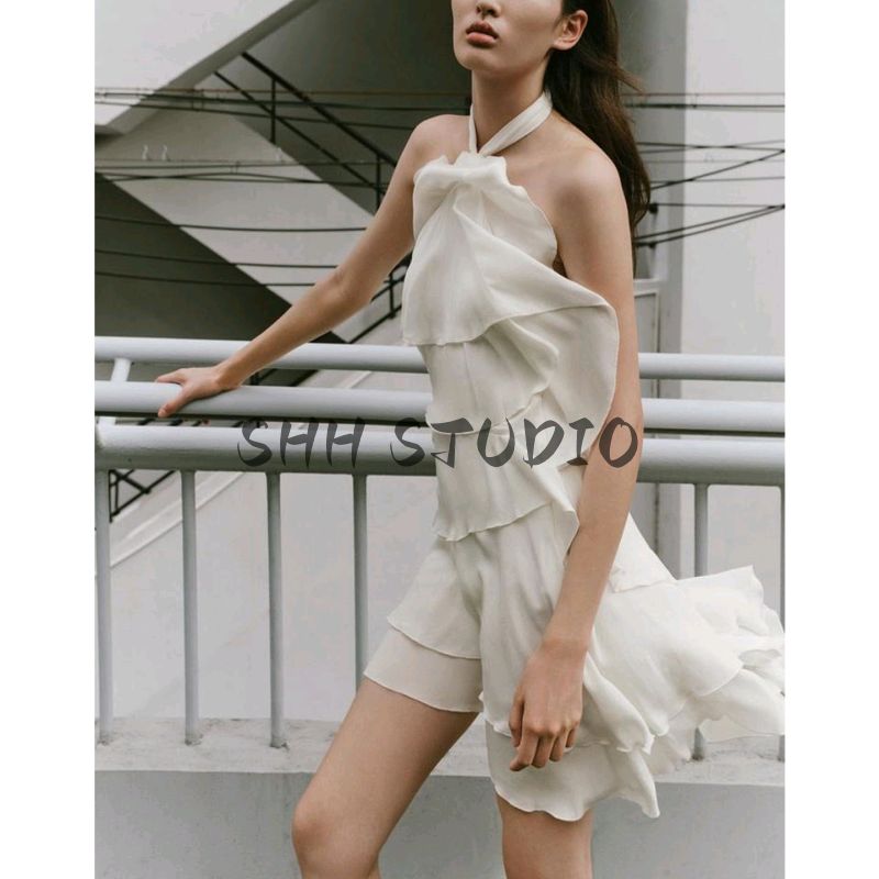 Autumn New Product Women clothes Asymmetric Hem Hanging Neck Long dress Laminated Decoration Mini Dress 8228811