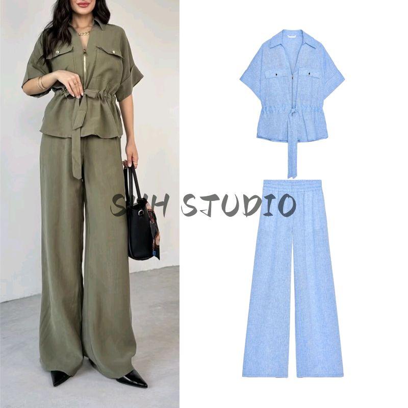 Lapel Curling Short sleeve Linen Blend Travel Hunting Shirts 2273996 High Waist Wide Leg Pants 2116996