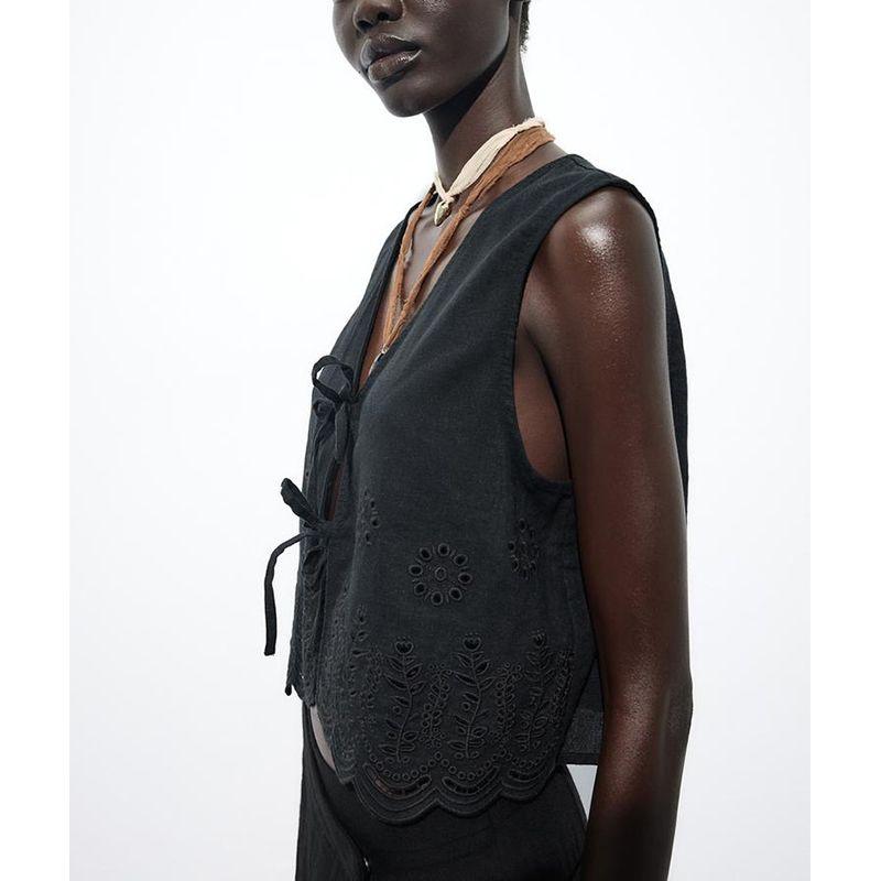 Summer Women's Linen Blend Bows Lace-up Cutout Embroidered V-neck Sleeveless Vest Waistcoat 6318044