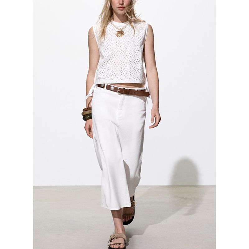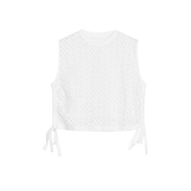 Spring and Summer Women's Clothing Bows Adjustable Hem Cotton Cut Out Embroidered Crew Neck Sleeveless Tops 4174379