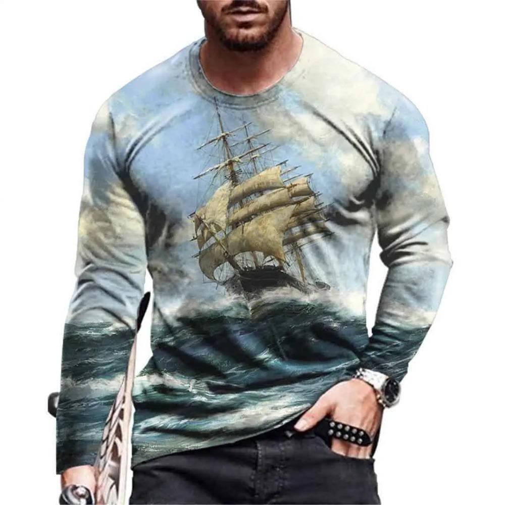 Навигация Парусник 3D Цифровая Печать Мужская Мода Тренд Футболка с Круглым Вырезом и Длинным Рукавом