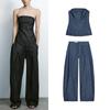 Spring New Women's Clothing Denim Strapless Chest Wrap Tops 6929263 Denim Effect Pleated Pants 6929213